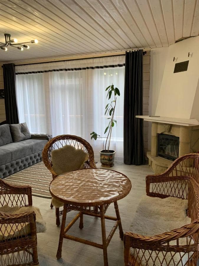 Надзвичайний комфорт відчувається, перш за все, завдяки оточенню дерева – воно скрізь: дерев’яні підлоги, стіни, стеля, сходи, навіть масивна кована люстра теж виконана з елементами дуба.