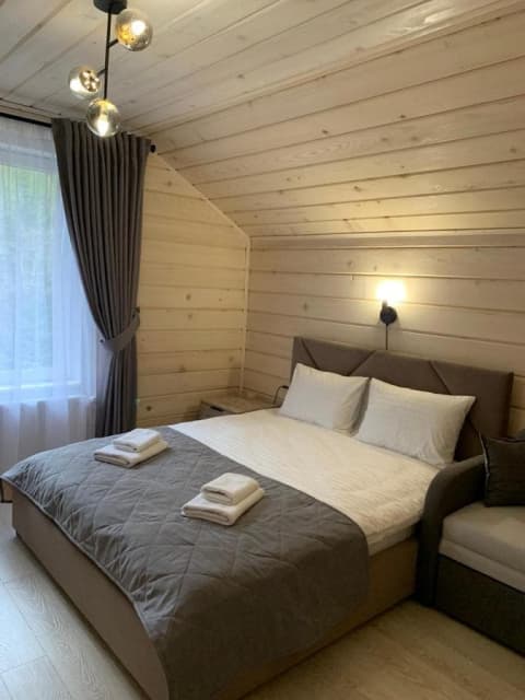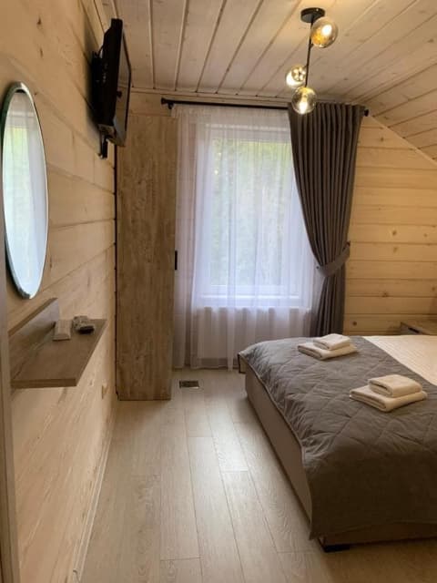 Мансарда. Двоспальне ліжко, комод, телевізор, санвузол (туалет, умивальник, душова кабіна, засоби особистої гігієни, халати, тапочки).