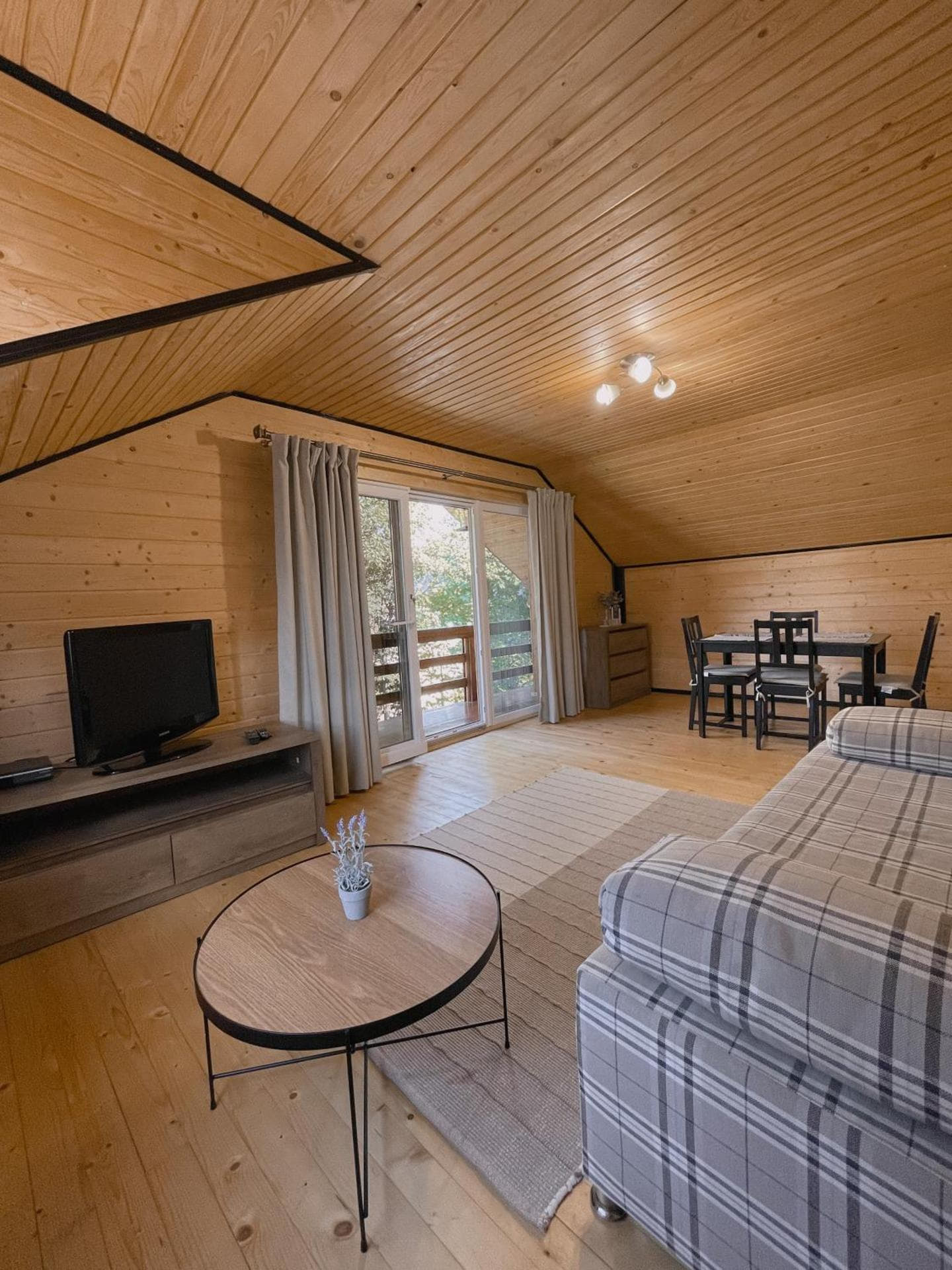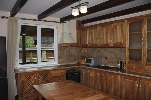 Є вітальня з м’яким куточком, обідня зона, повністю обладнана кухня (плита, духовка, холодильник, мікрохвильова піч, чайник, посуд), а також тераса з барбекю та місця для відпочинку на подвір’ї.