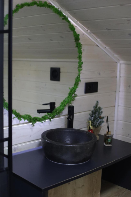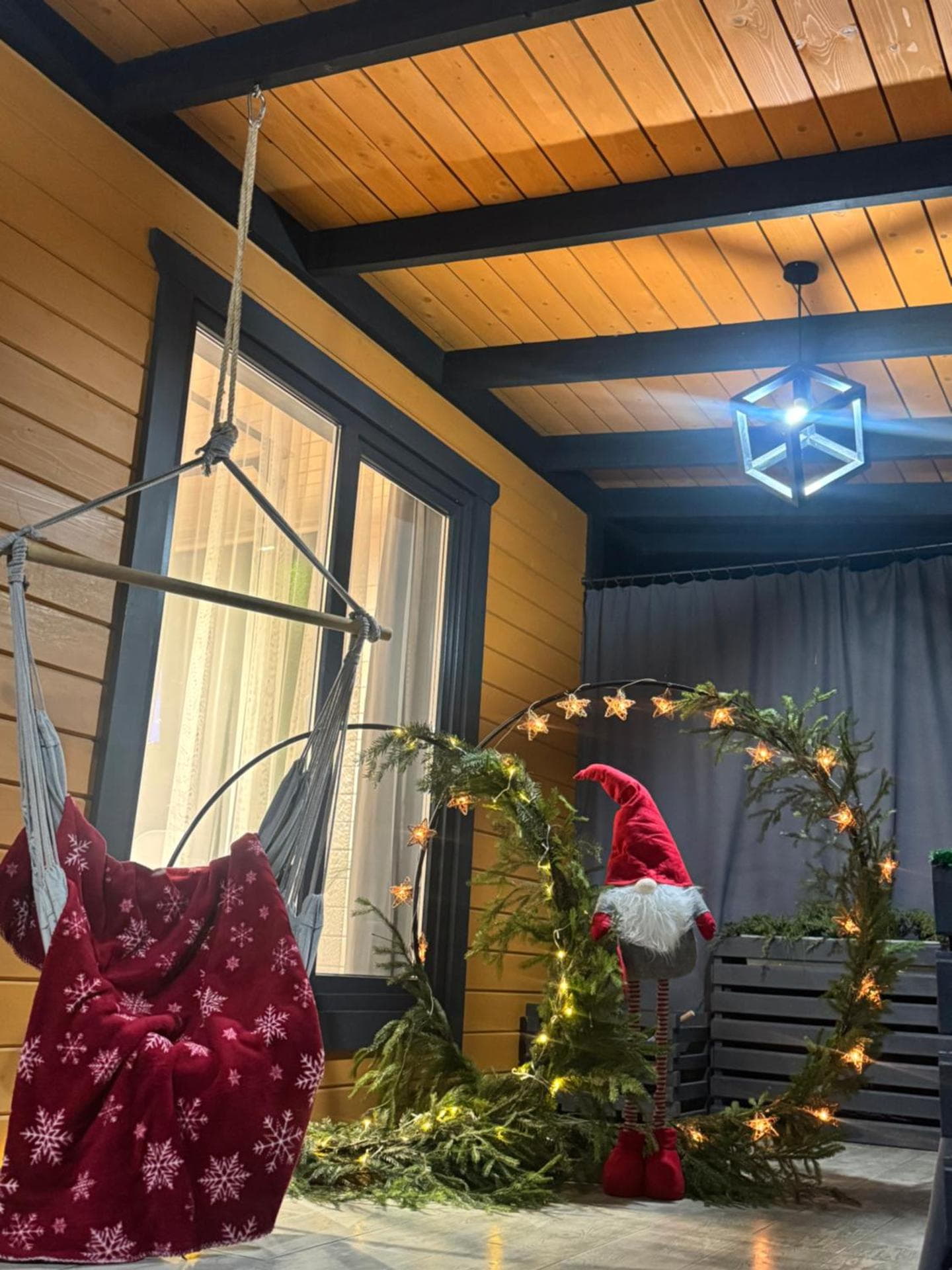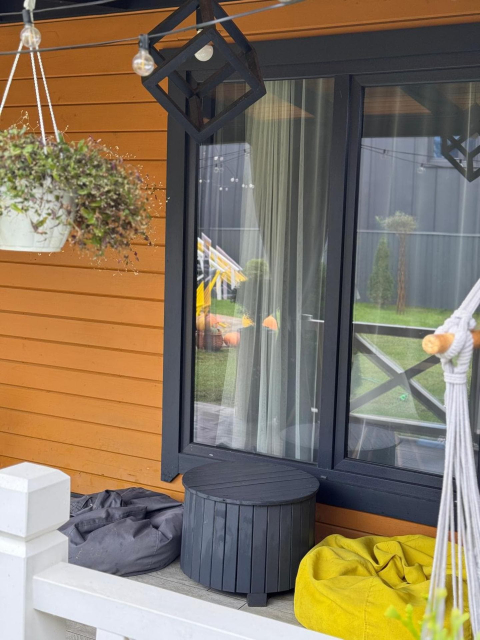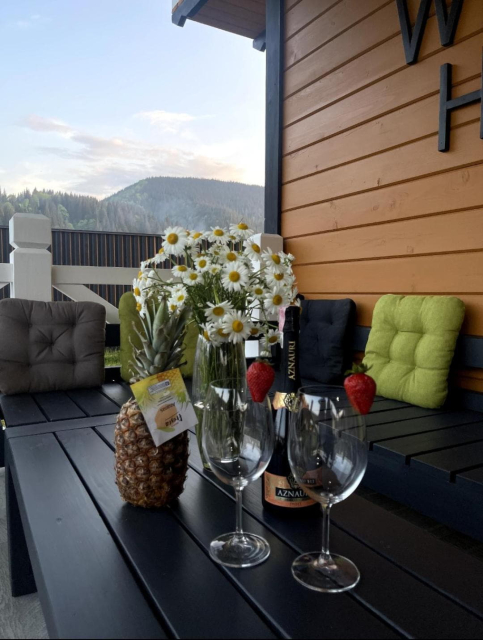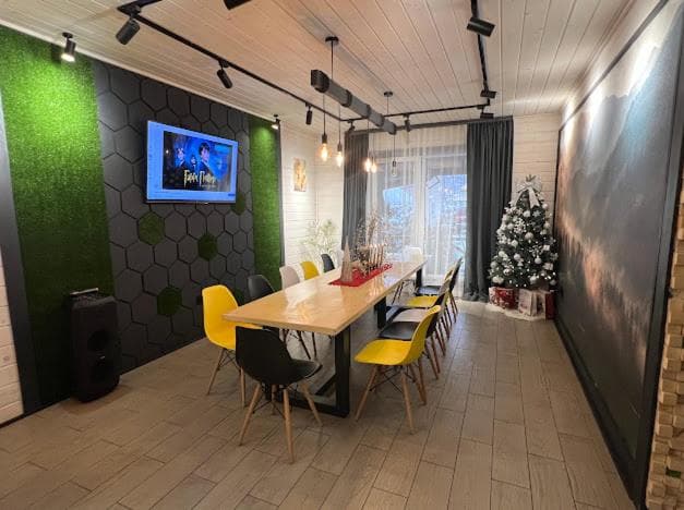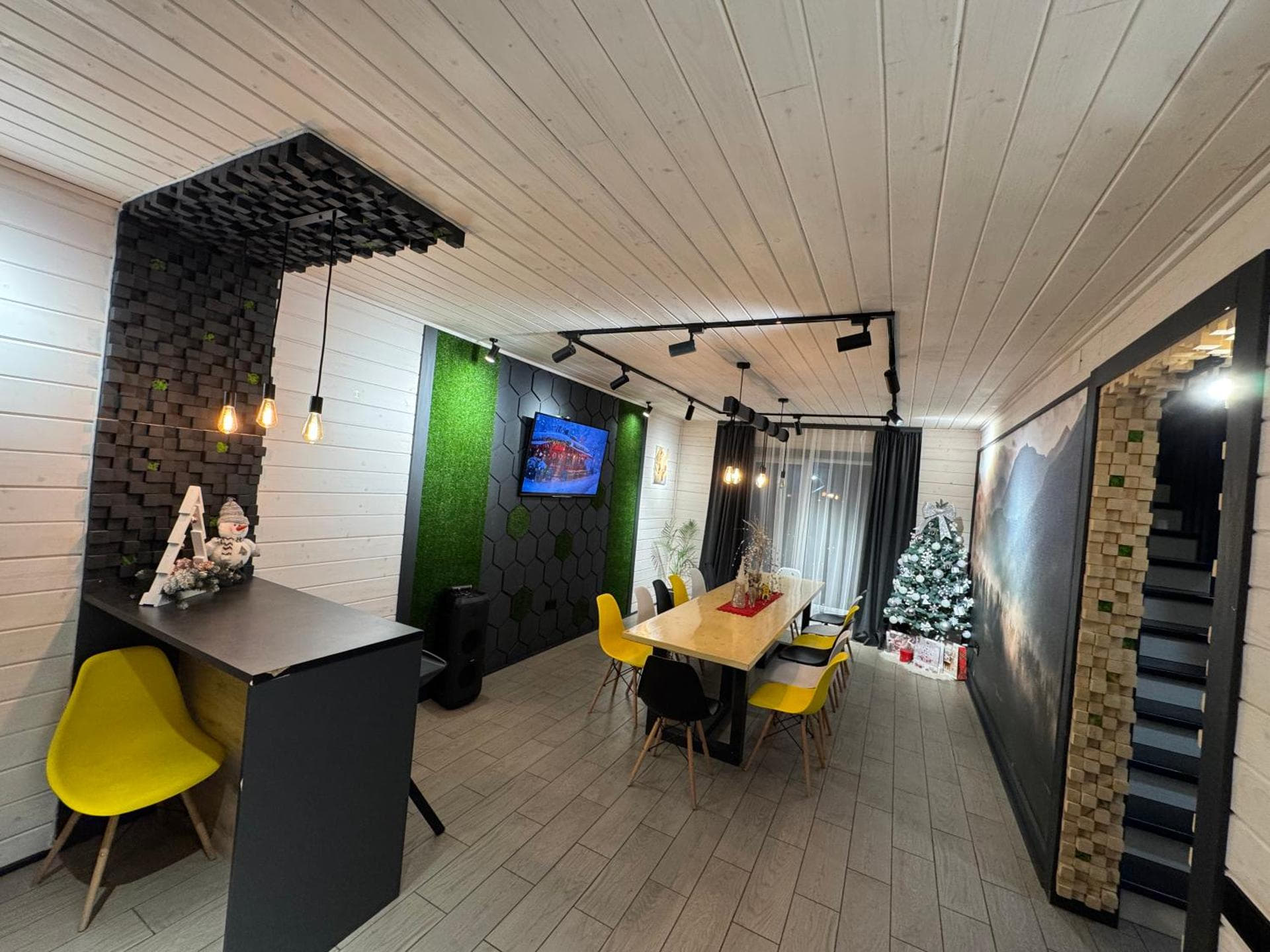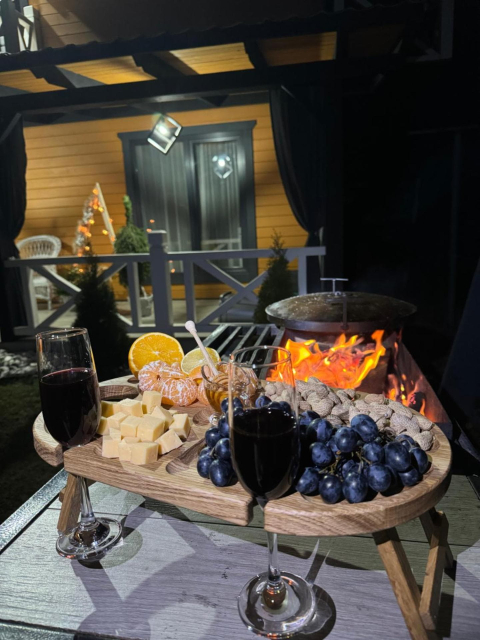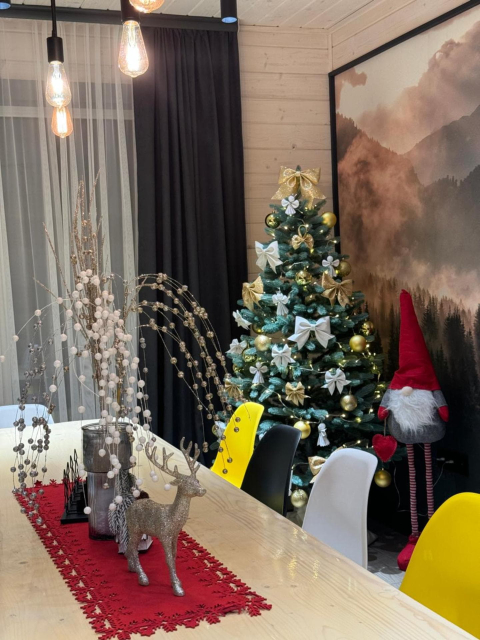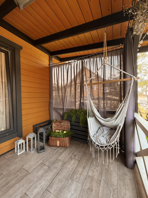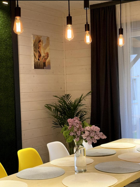 Перший поверх: кухня (електроплита, мікрохвильова піч, холодильник, електрочайник, посуд, мийка), великий зал із телевізором і обіднім столом, два номери з двоспальними ліжками та вішалками для одягу, санвузол із душем, туалетом та умивальником, вихід на терасу.