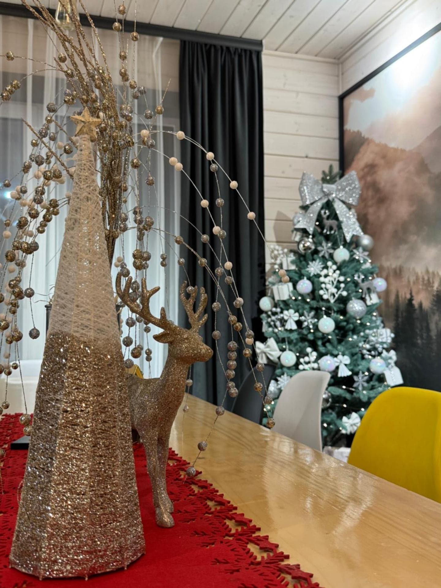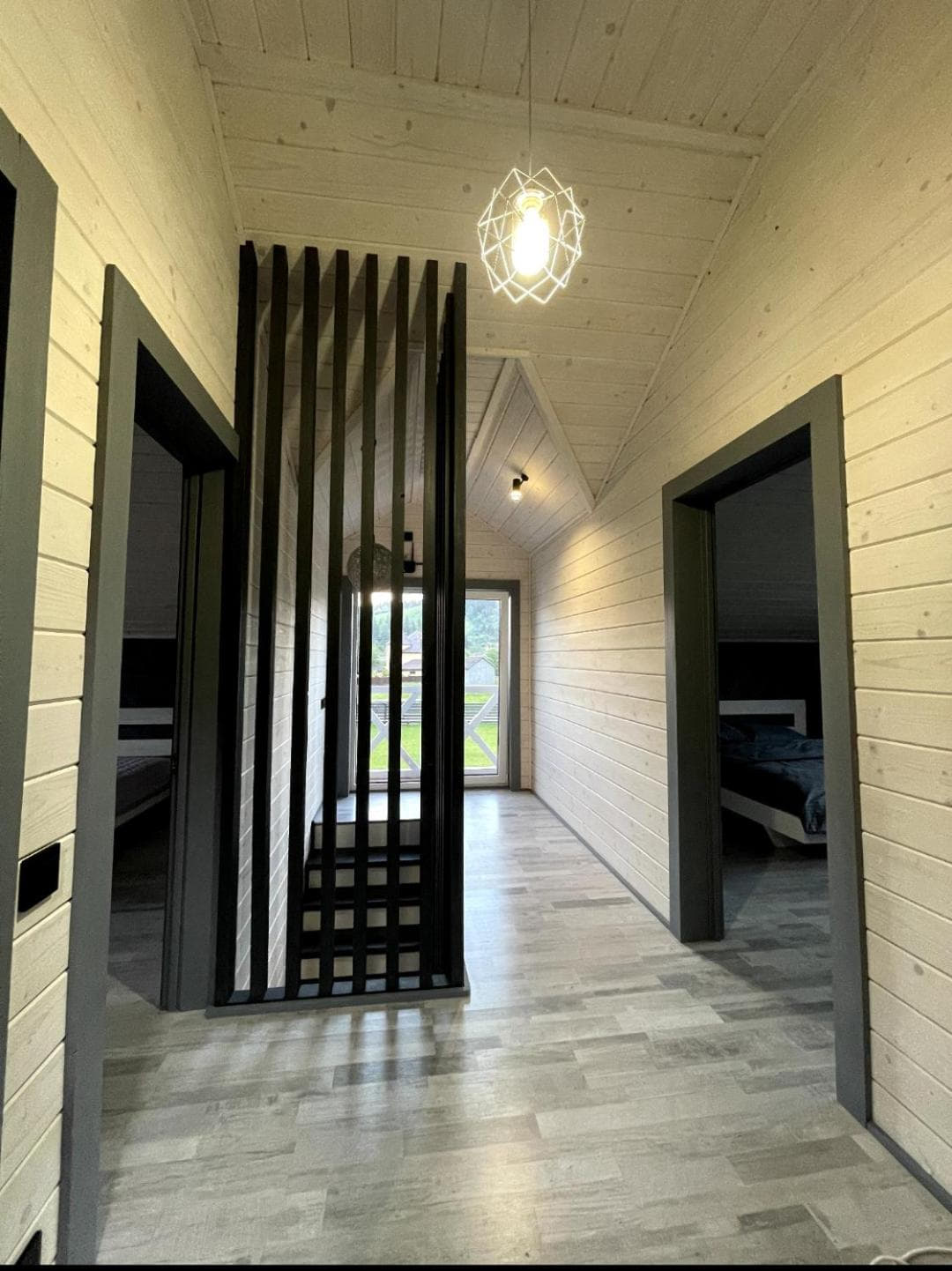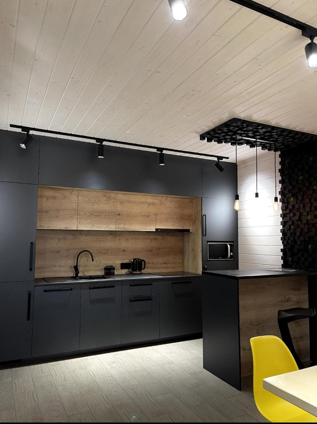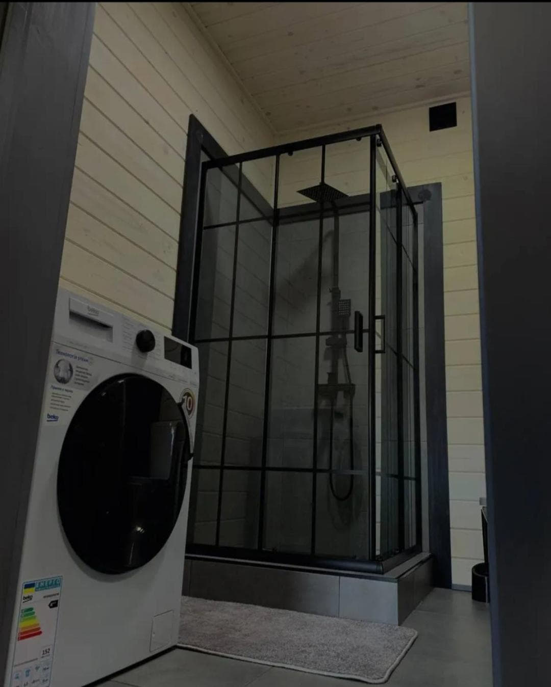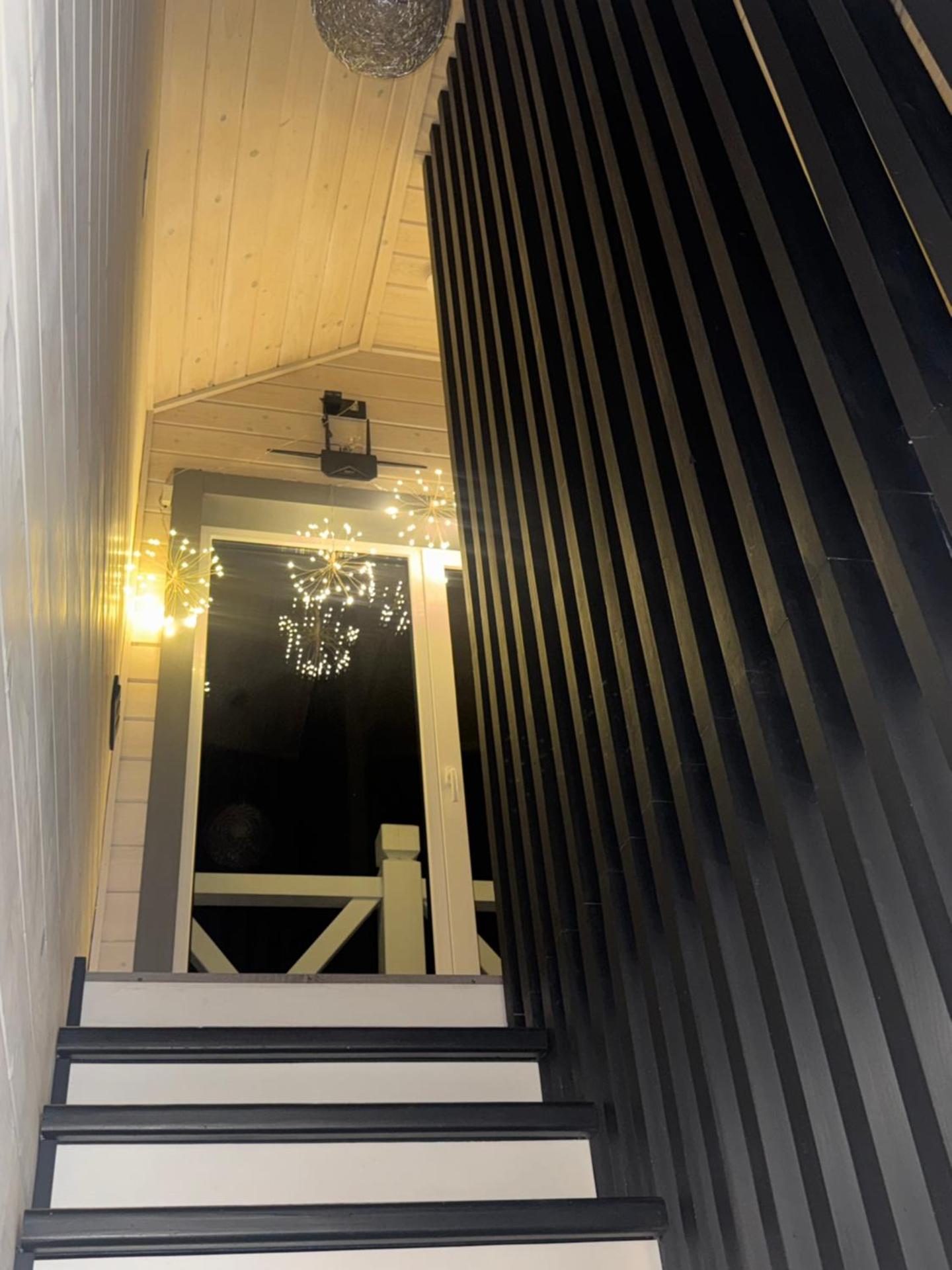 Перший поверх: кухня (електроплита, мікрохвильова піч, холодильник, електрочайник, посуд, мийка), великий зал із телевізором і обіднім столом, два номери з двоспальними ліжками та вішалками для одягу, санвузол із душем, туалетом та умивальником, вихід на терасу.