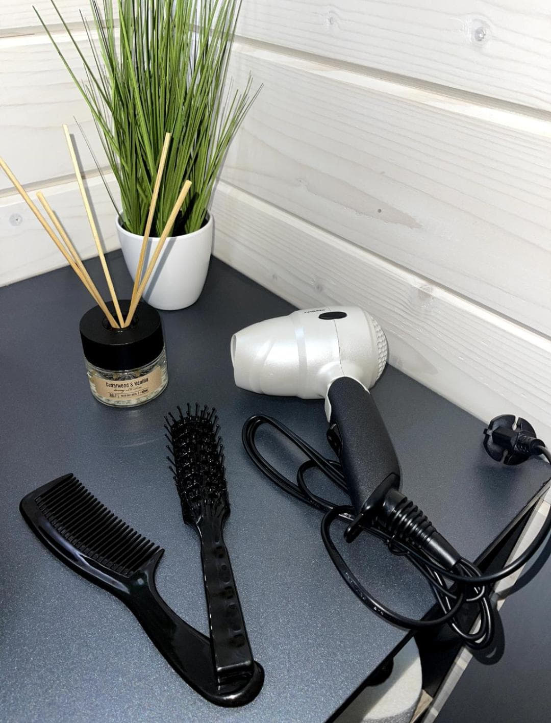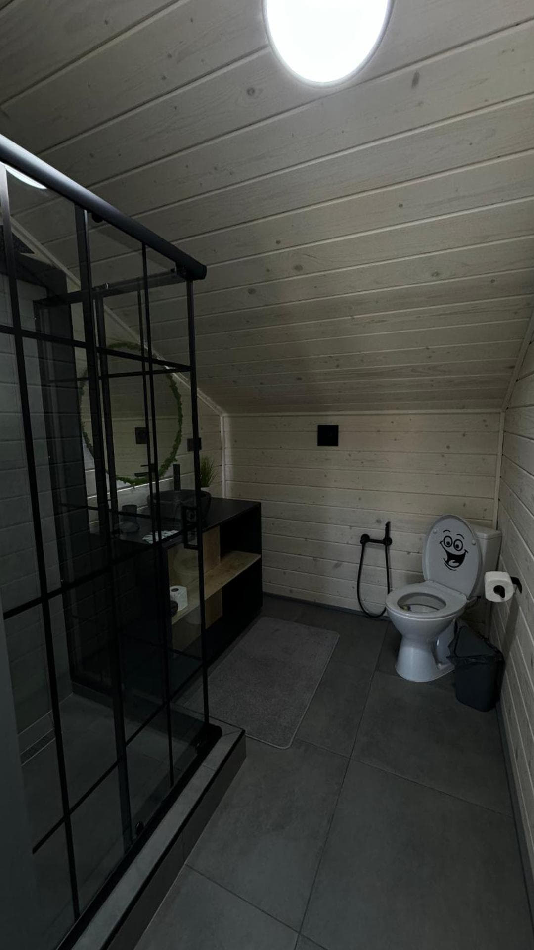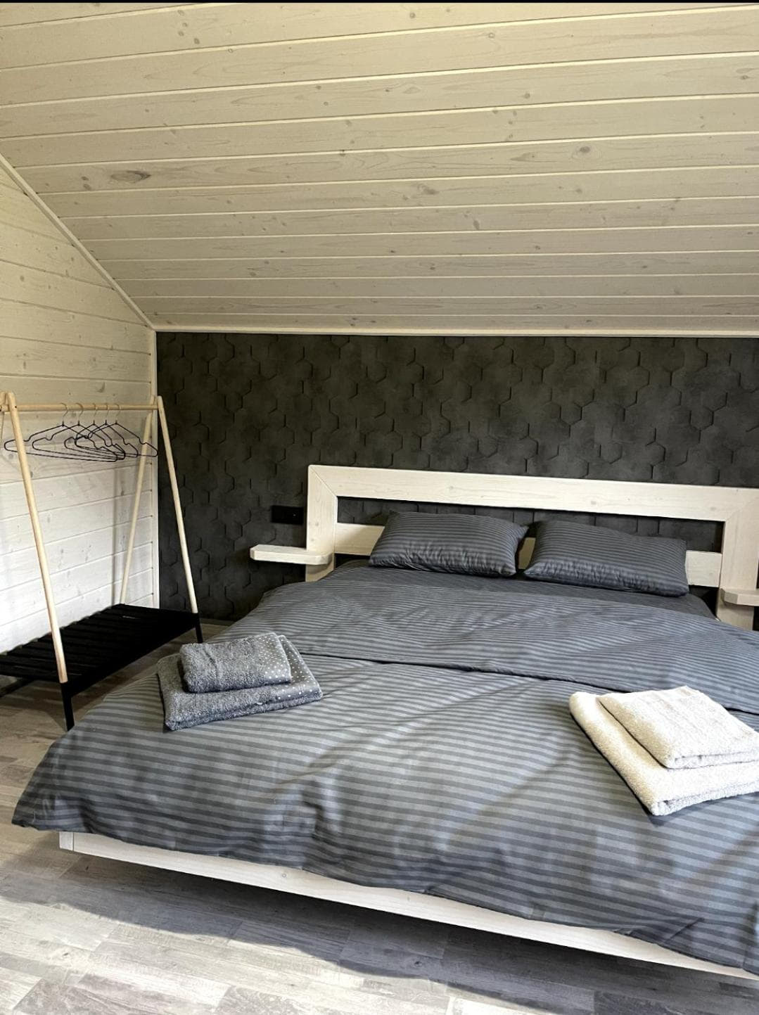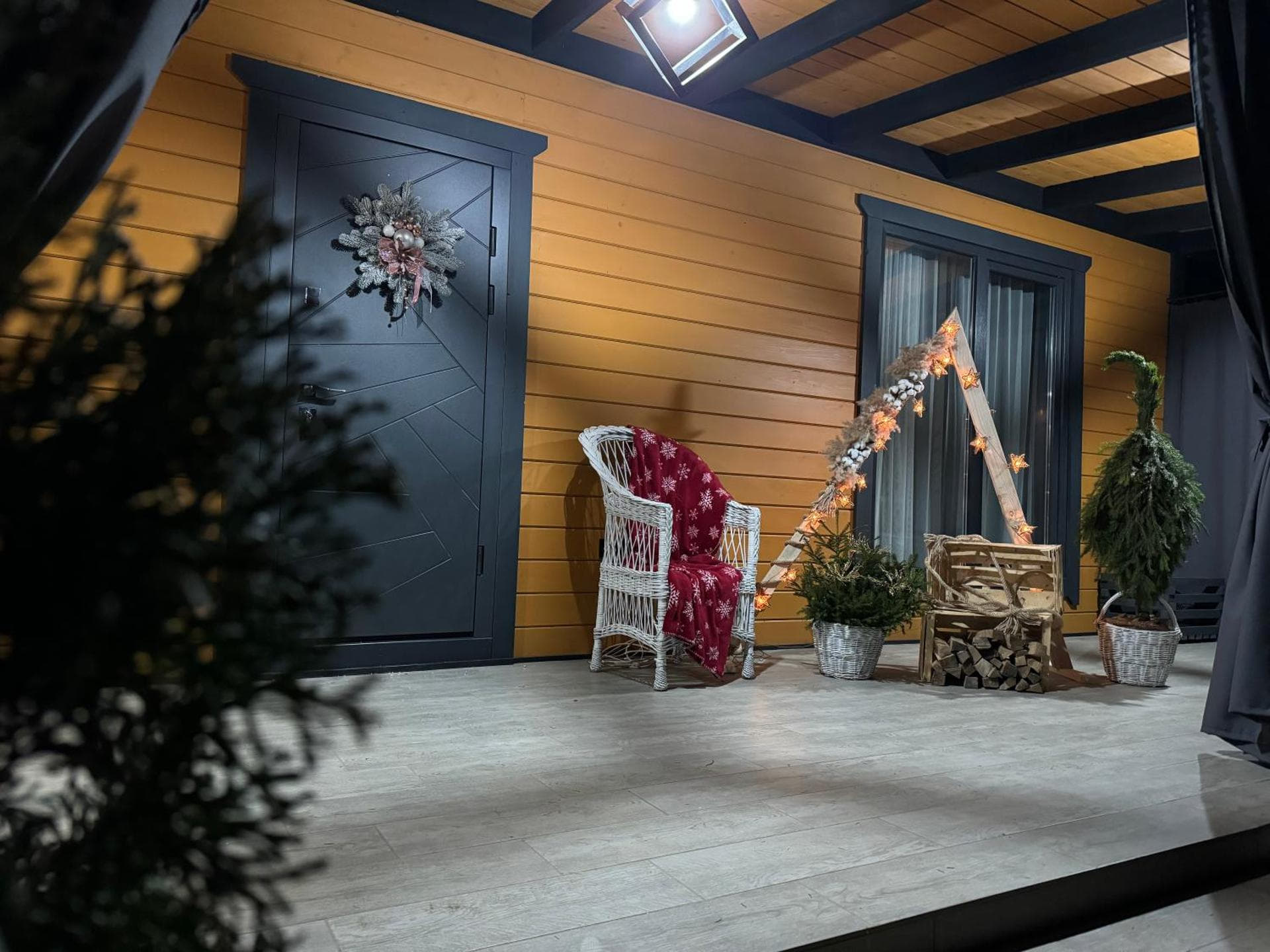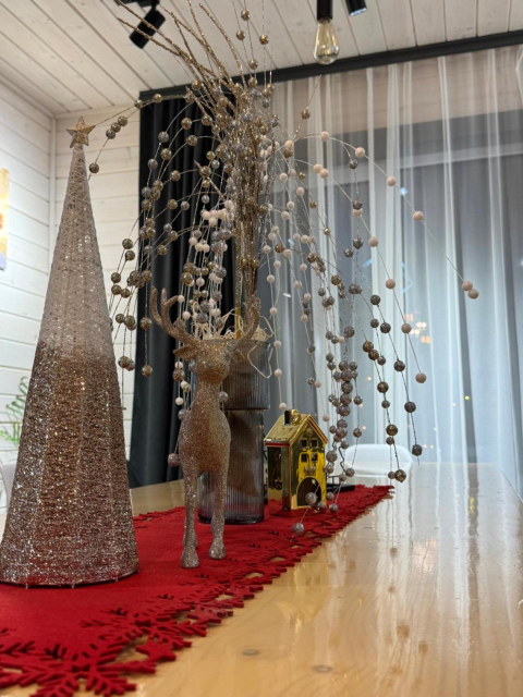 Перший поверх: кухня (електроплита, мікрохвильова піч, холодильник, електрочайник, посуд, мийка), великий зал із телевізором і обіднім столом, два номери з двоспальними ліжками та вішалками для одягу, санвузол із душем, туалетом та умивальником, вихід на терасу.