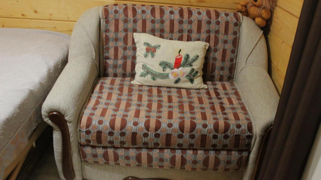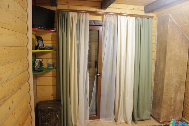 На першому поверсі — кухня з піччю-лежанкою, газовою плитою, холодильником, посудом, мийкою, обіднім столом і телевізором.