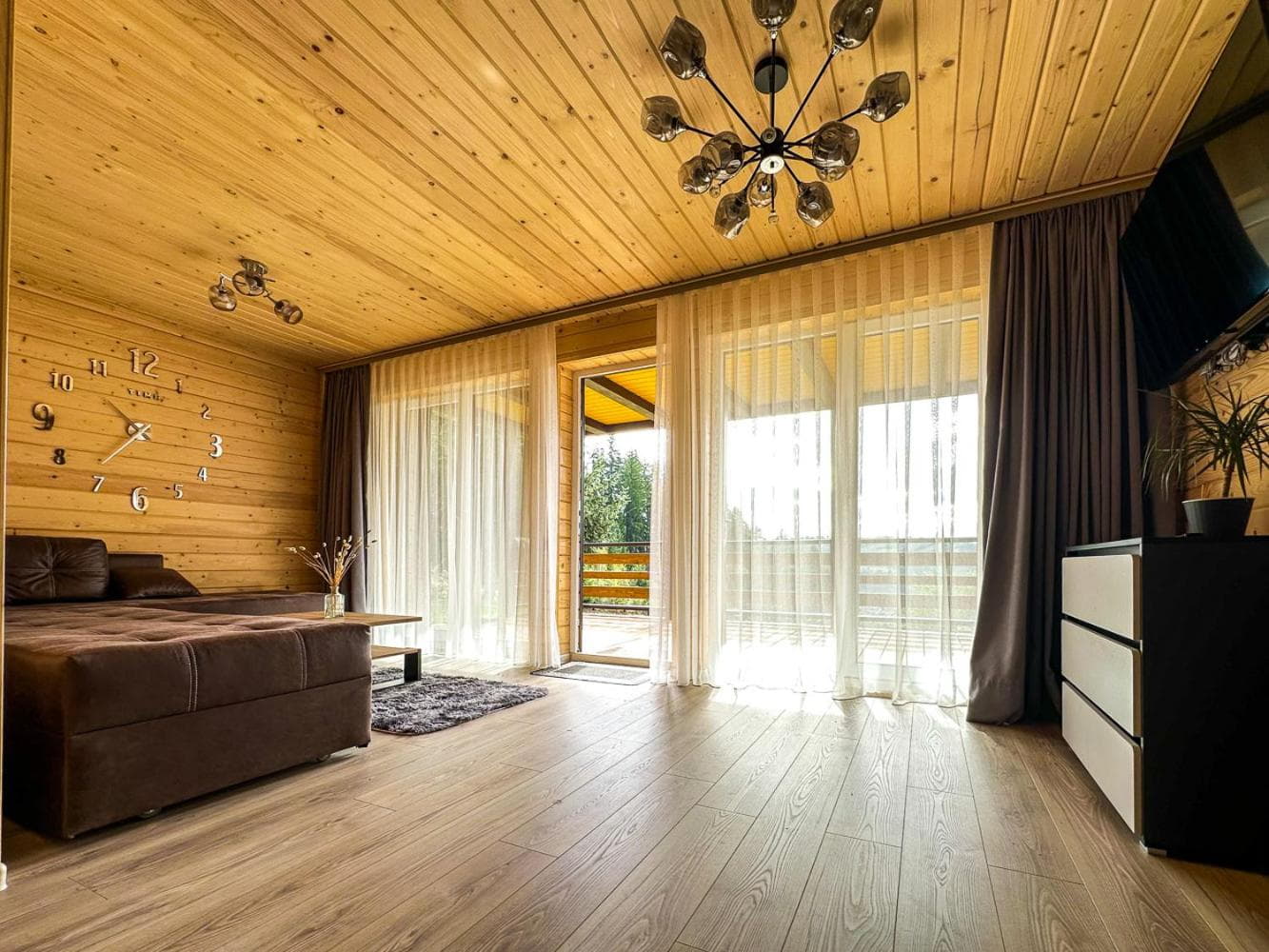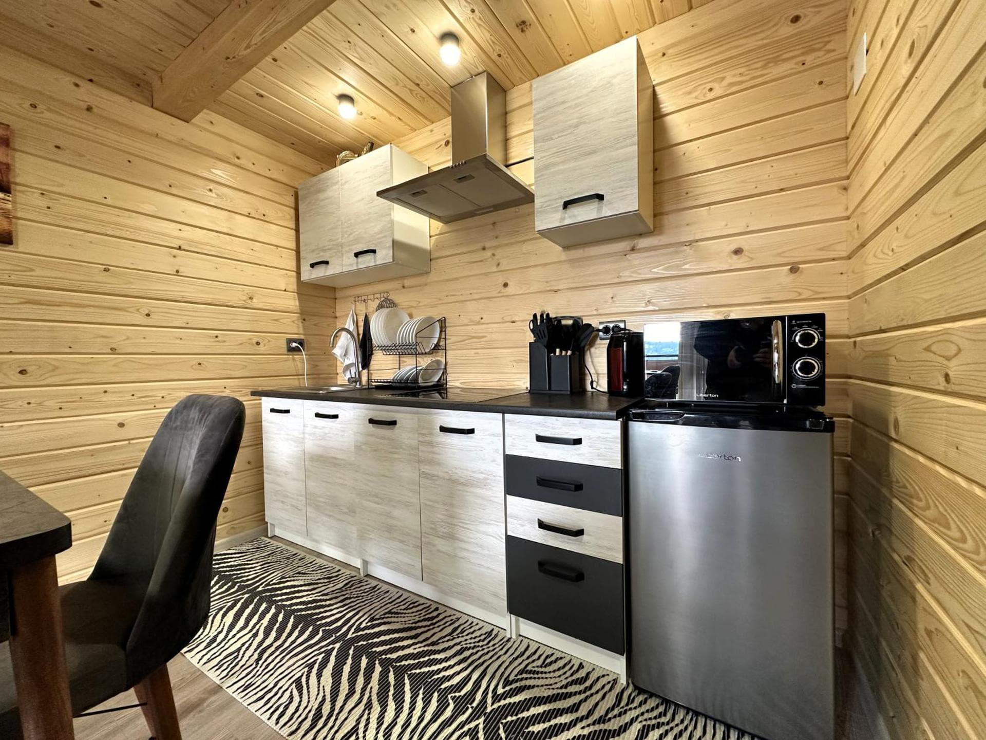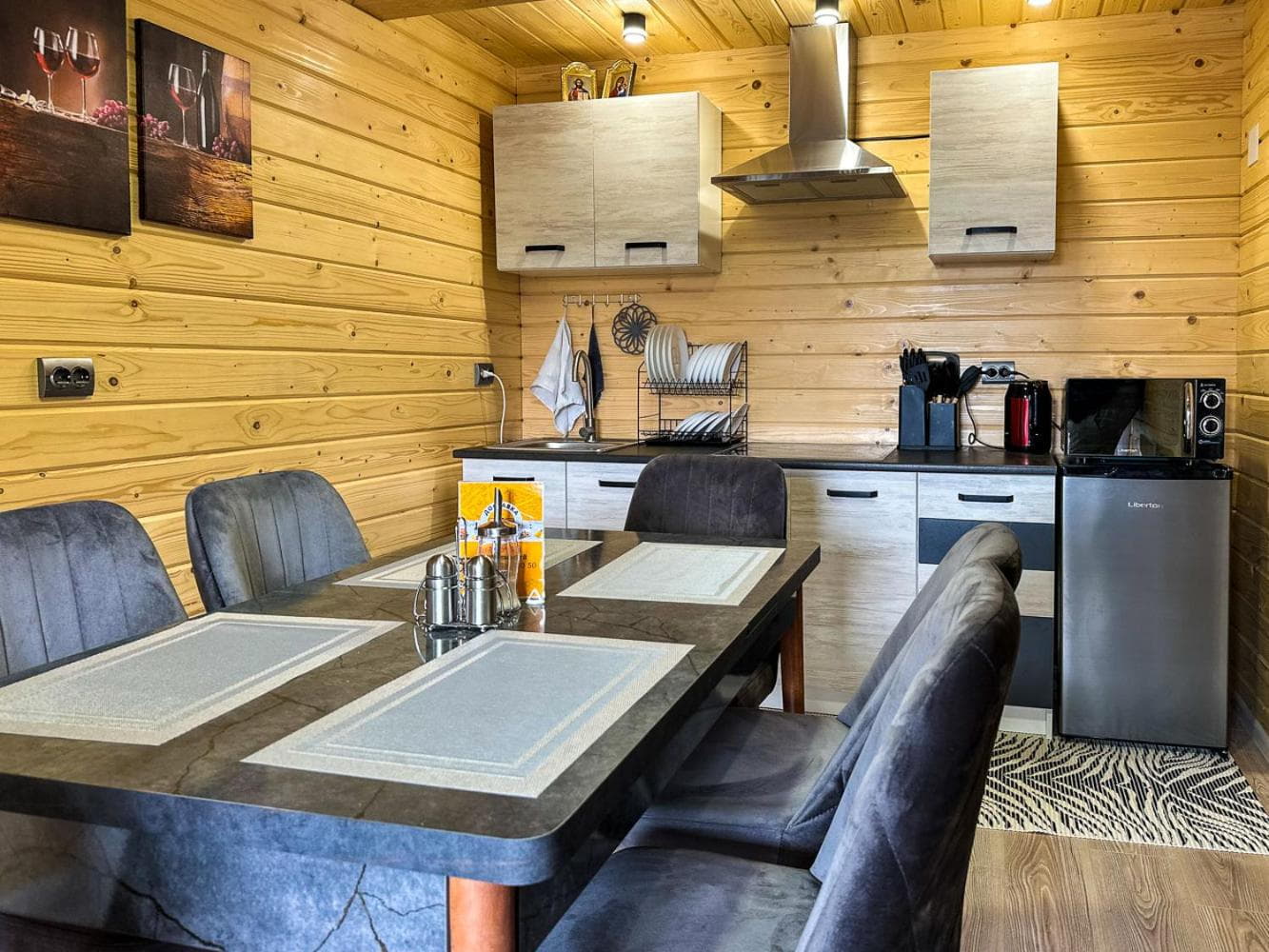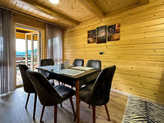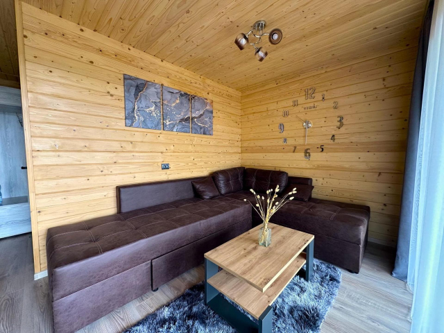 На першому поверсі облаштована простора кухня-вітальня з електричною плитою, мікрохвильовою піччю, холодильником, електрочайником, кавоваркою, мийкою та повним набором посуду. У вітальні є розкладний диван, який може використовуватись як додаткове спальне місце для 2–3 осіб, великий обідній стіл, телевізор і вихід на терасу.