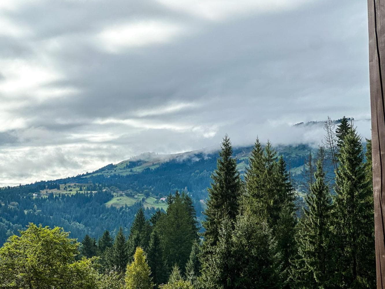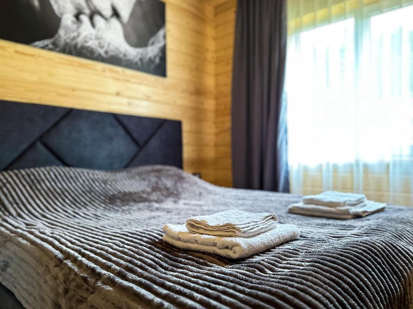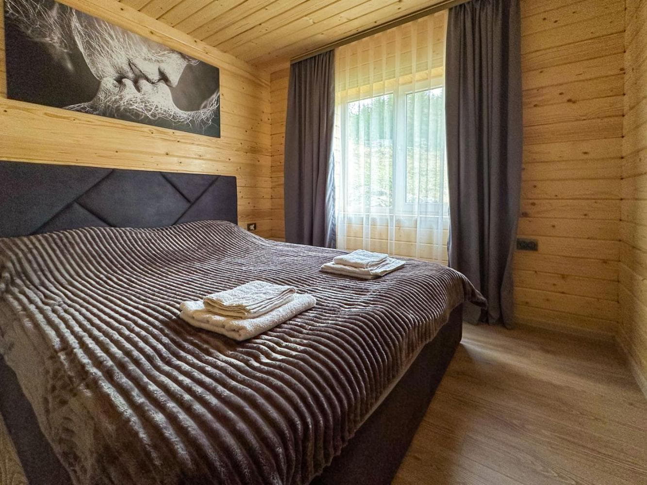 Окрема спальня оснащена двоспальним ліжком, комодом для речей та вікном із панорамним видом на гори. Санвузол включає душову кабіну, умивальник, туалет і фен.