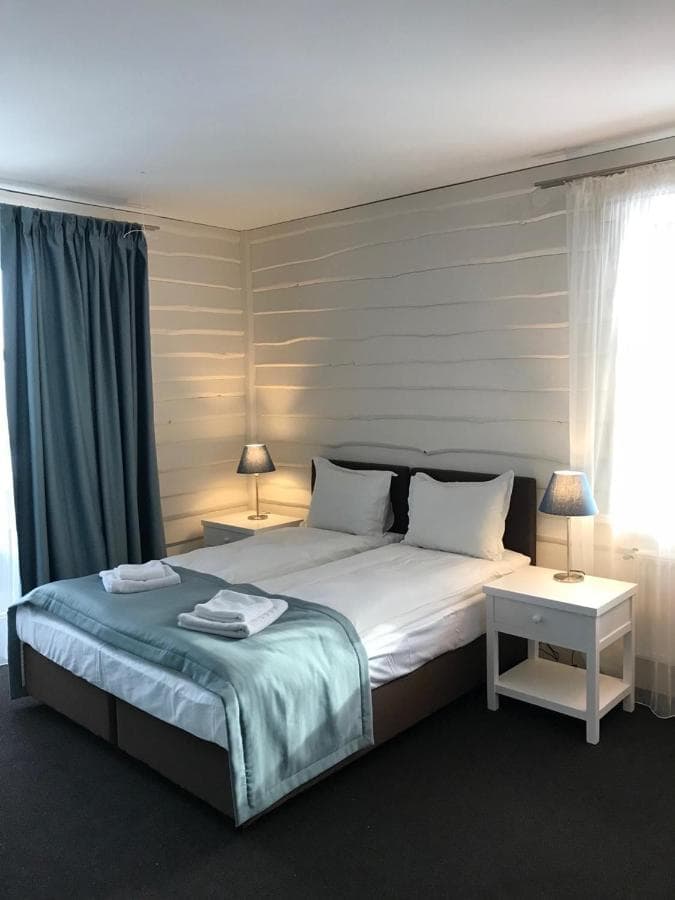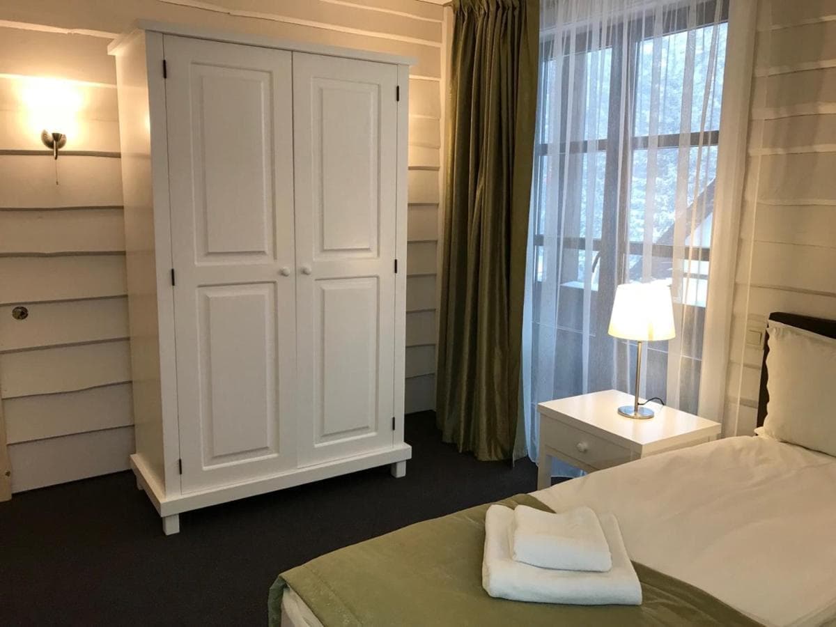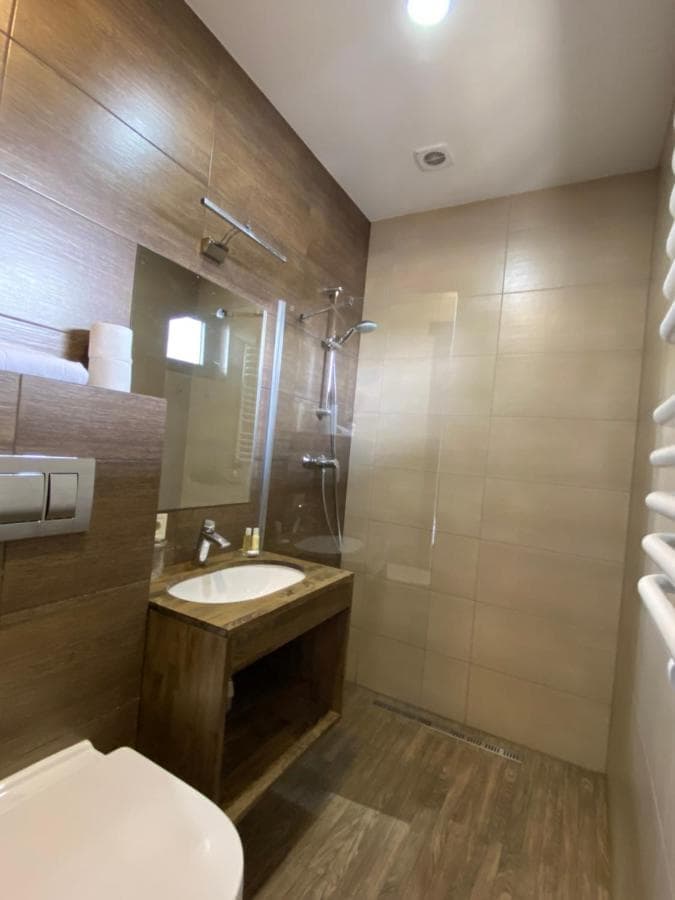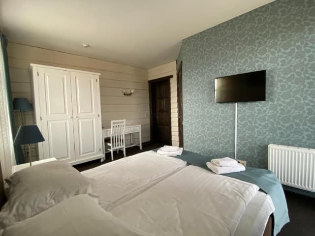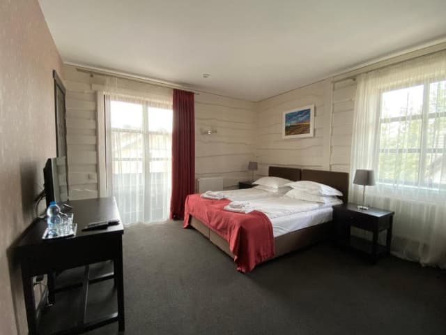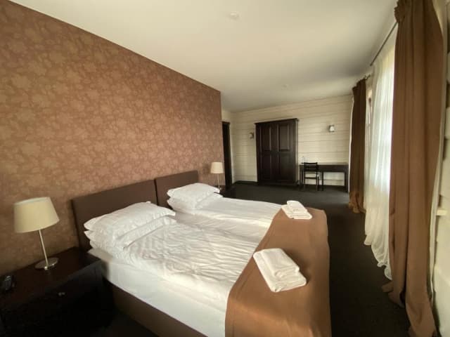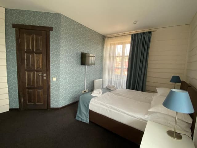 На другому поверсі — двокімнатний номер (спальня — двоспальне ліжко, розкладне крісло, телевізор, вітальня — розкладний диван, шафа для одягу, санвузол — ванна, туалет, умивальник), півлюкс (двоспальне ліжко, 2 розкладні крісла, шафа для одягу, телевізор, камін, санвузол — душ, туалет, умивальник).