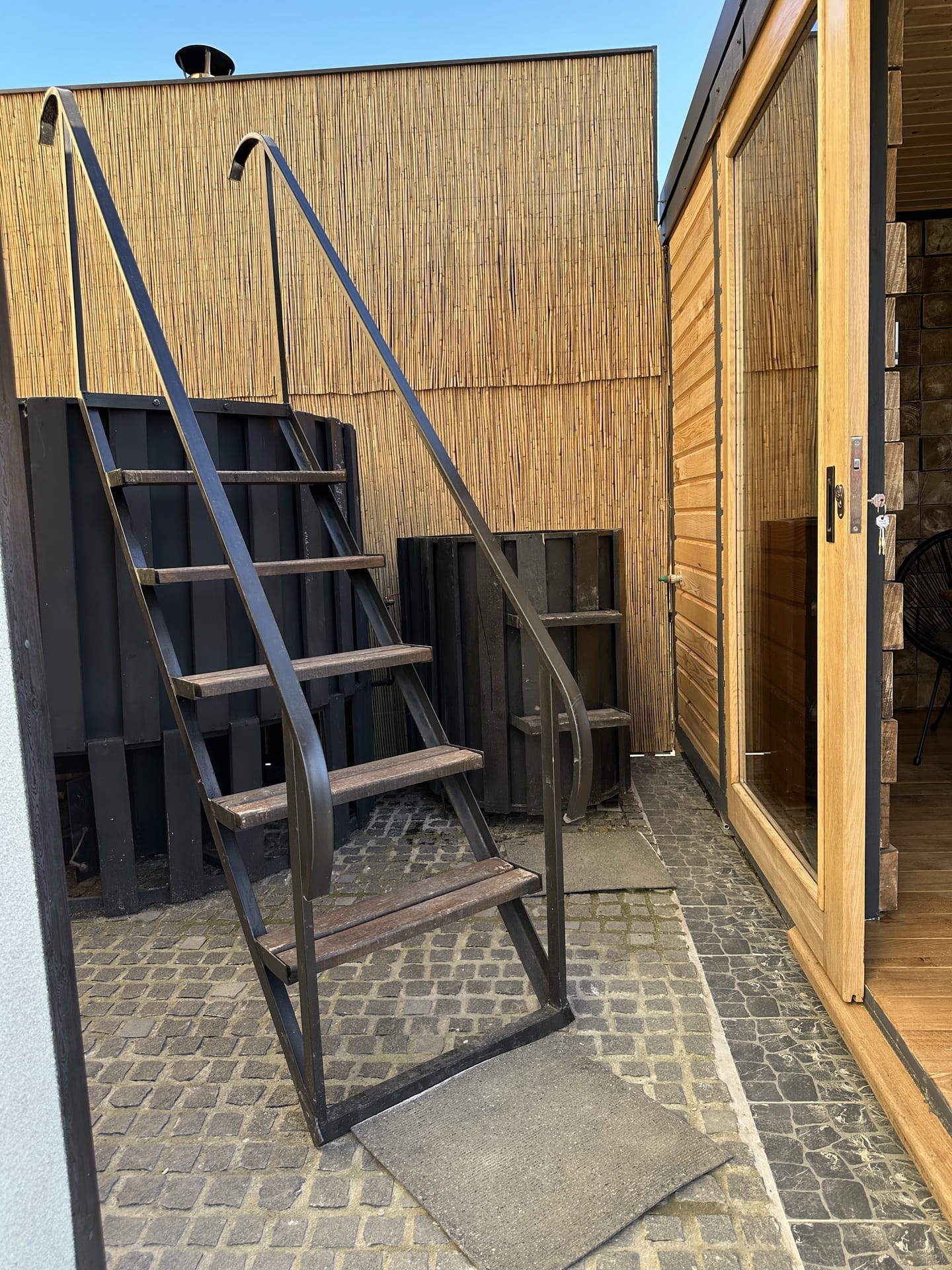 На першому поверсі розташована кухня, повністю обладнана всім необхідним: пральною машиною, холодильником, мікрохвильовою піччю, електрочайником, а також ванною кімнатою та душем — усе для вашого комфортного відпочинку.