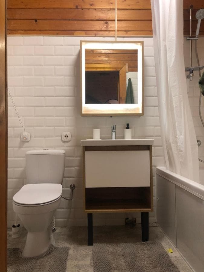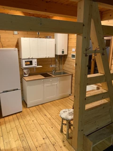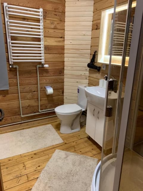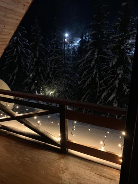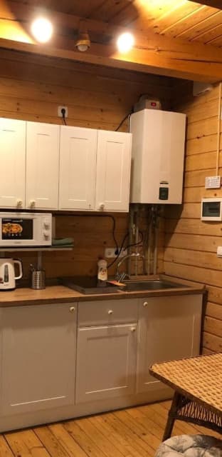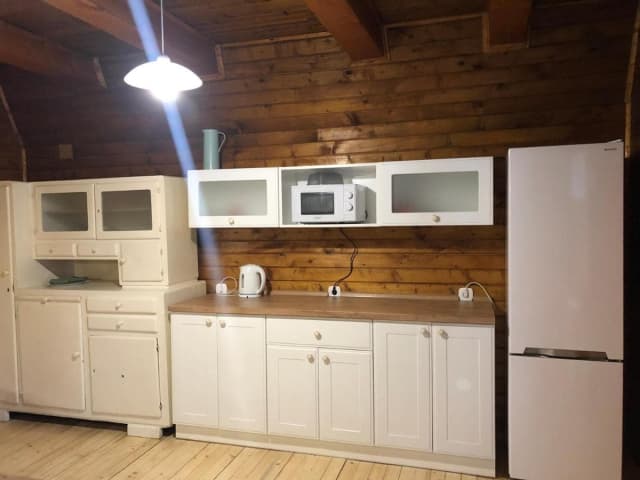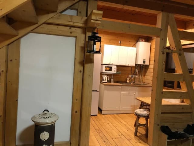 На першому поверсі - повністю обладнана кухня: посудомийна машина, холодильник, газова плита, духовка, електрочайник, мікрохвильова піч, весь необхідний посуд, кавоварка, їдальня, вітальня з каміном, телевізор, м'який куточок та санвузол з ванною.