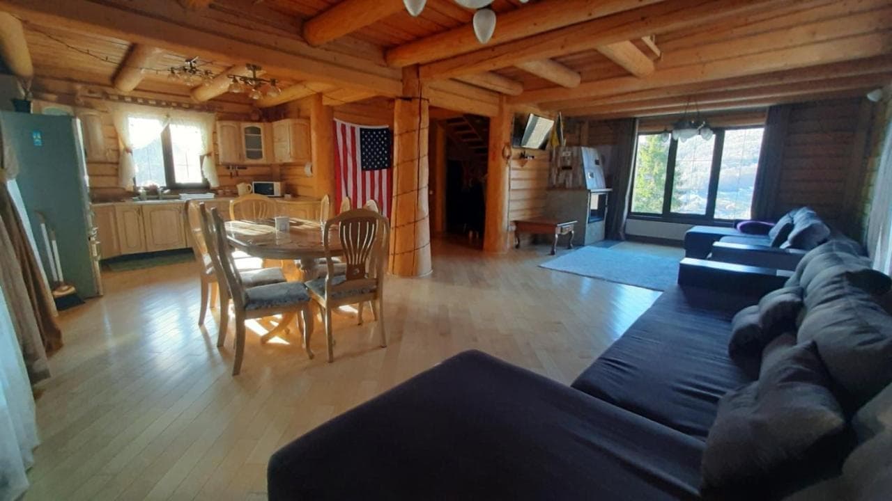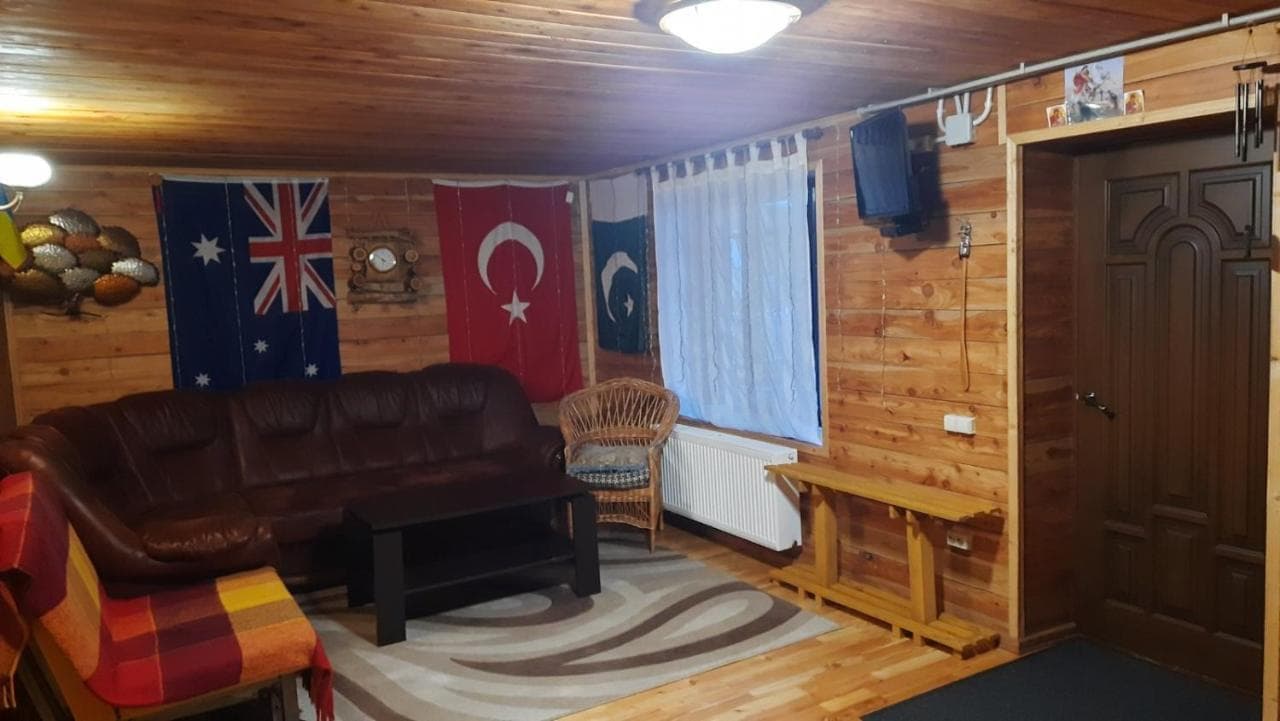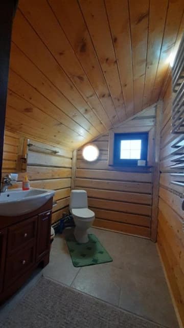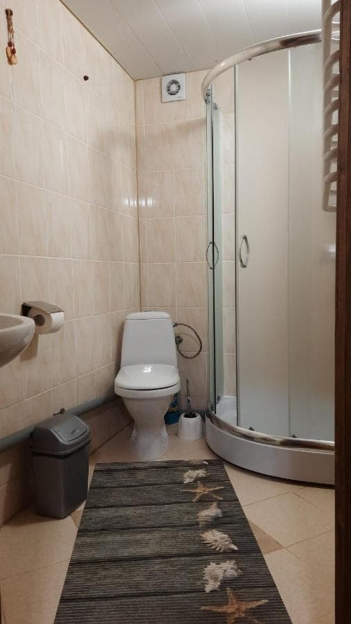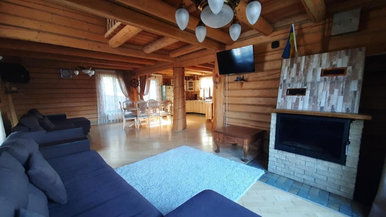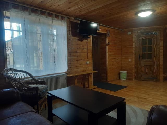 На другому поверсі знаходитсья кухня (газова плита, холодильник, мікрохвильова піч, електрочайник, посуд, мийка, обідній стіл), вітальня (2 дивани, телевізор), санвузол (душова кабіна, туалет, умивальник, засоби гігієни).