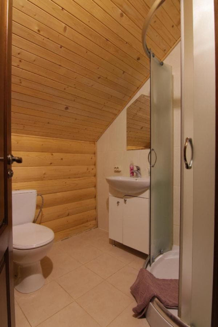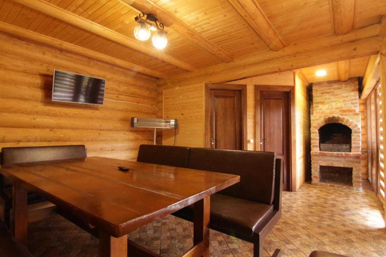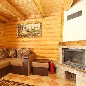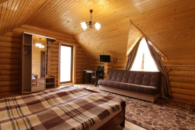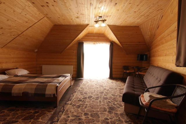 Перший поверх: простора кухня-вітальня з каміном, телевізором, обіднім столом, розкладним диваном; три стандартні номери з двоспальним або двома односпальними ліжками, шафою, телевізором та окремим санвузлом.