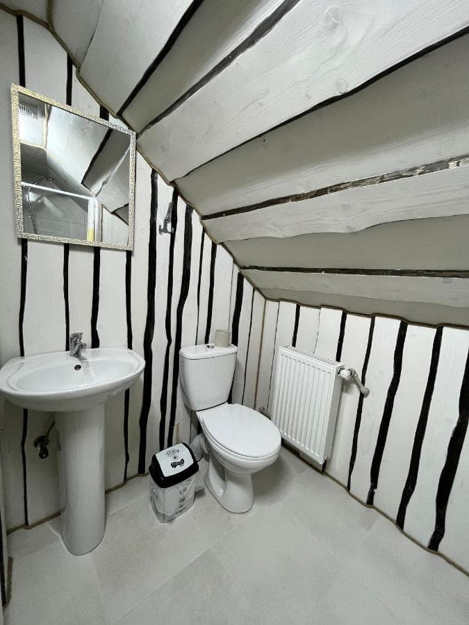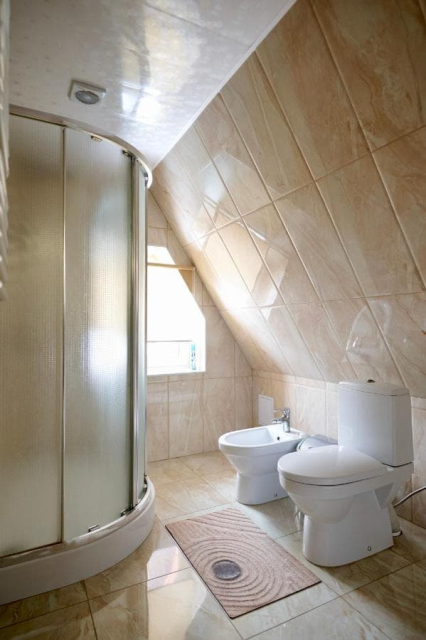 Простора кухня: газова плита, мікрохвильова піч, електрочайник, мийка, необхідний посуд. 3 двомісні номери, у кожному — двоспальне ліжко. 2 санвузли: один з душем, туалетом і умивальником; другий — з туалетом та умивальником.