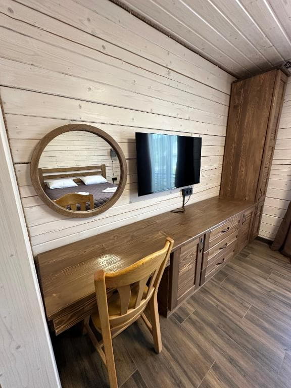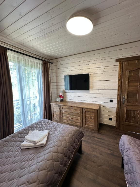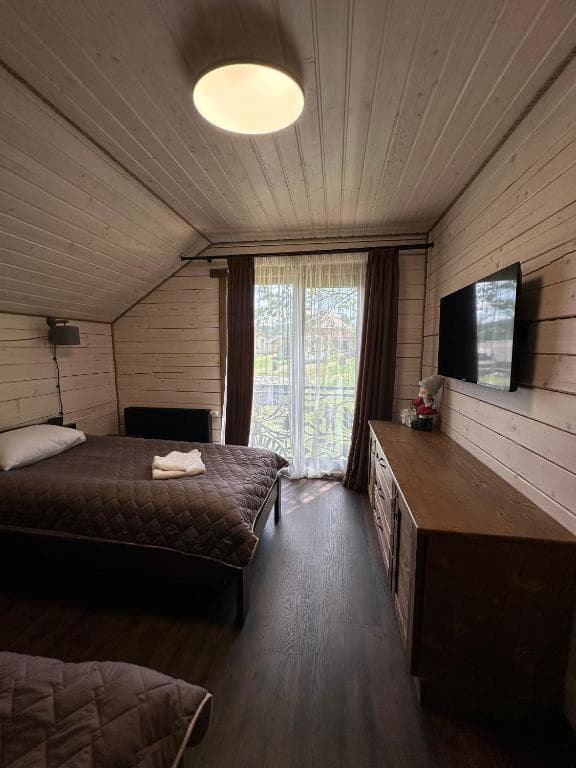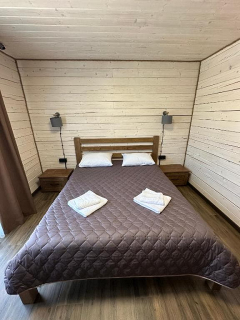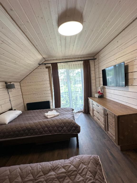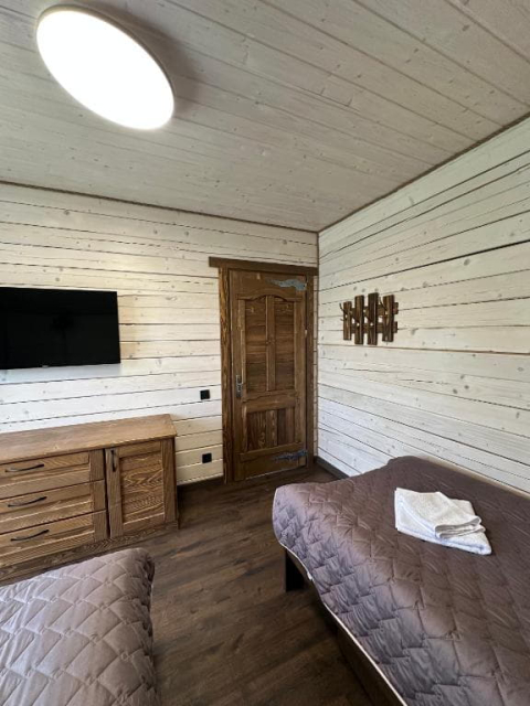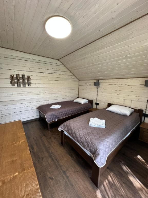 На першому поверсі котеджів розташована простора вітальня з м’яким шкіряним куточком і великим телевізором, що робить її ідеальним місцем для відпочинку та спілкування. Тут також знаходиться повністю обладнана кухня з великим обіднім столом, де можна зручно готувати та насолоджуватися їжею разом. Перший поверх доповнює санвузол з усім необхідним і спальня з двоспальним ліжком та власним телевізором.