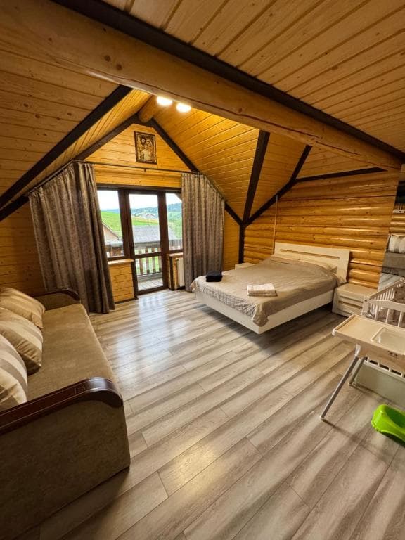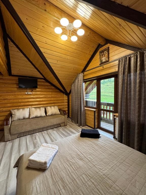 Просторий чотиримісний номер площею 18–20 м² ідеально підходить для родини або компанії друзів. У номері є двоспальне ліжко з ортопедичним матрацом та тумбами, зручний диван-ліжко, шафа з дзеркалом, поличками та вішалками. Для найменших гостей передбачене дитяче ліжечко з ортопедичним матрацом і комплектом постелі. Номер обладнаний телевізором із Wi-Fi та телебаченням, а з балкона відкривається мальовничий вид на гори. Для зручності гостей передбачено ковдри, подушки, комплекти постелі та рушники різного розміру.