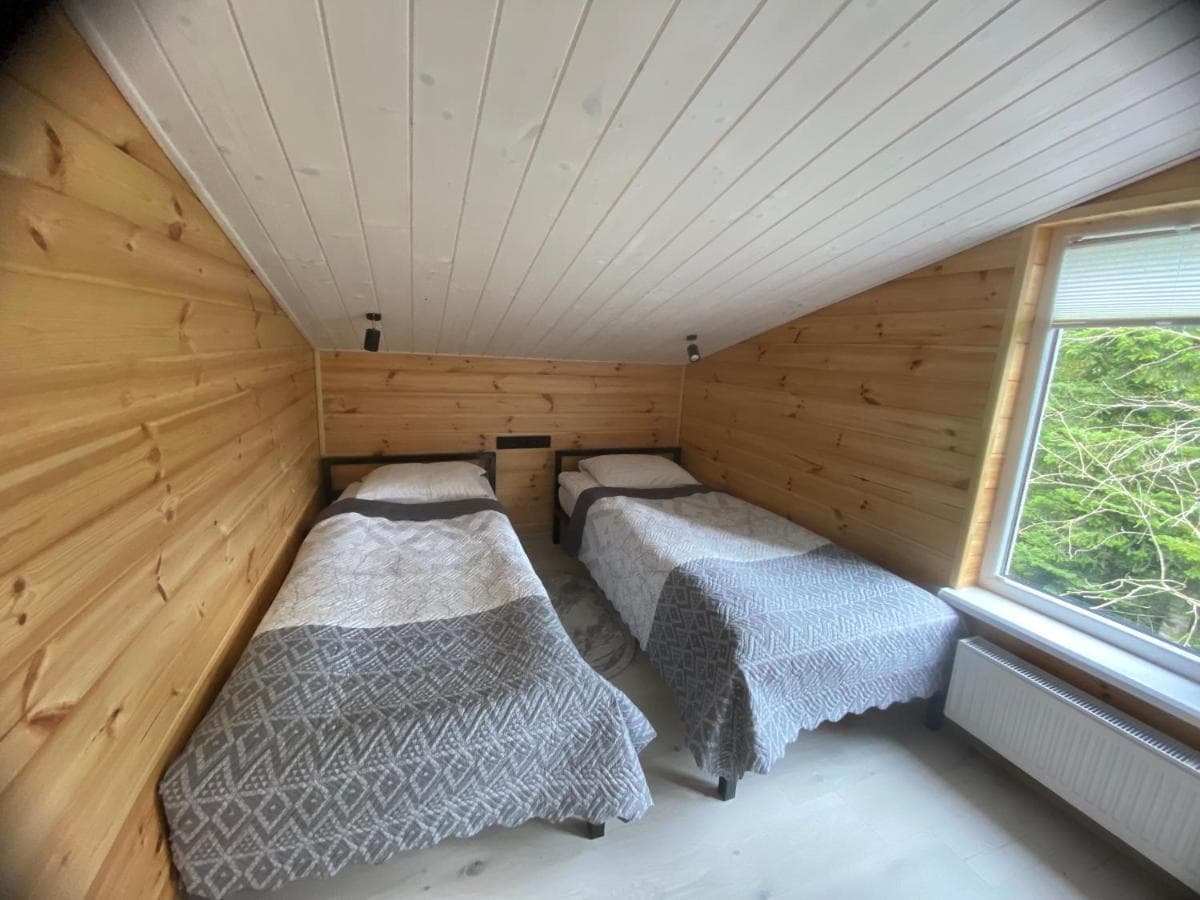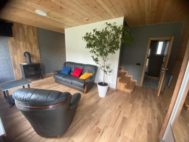 Шале з двома спальнями (2 шале) — кухня (індукційна плита, холодильник, мікрохвильова піч, мультиварка, електрочайник, духова шафа, посудомийна машина, тостер, мийка, посуд, обідній стіл, камін), 2 спальні (у кожній є двоспальне або 2 односпальні ліжка, шафа для одягу, телевізор), санвузол (душ, туалет, умивальник, пральна машина, парова праска).