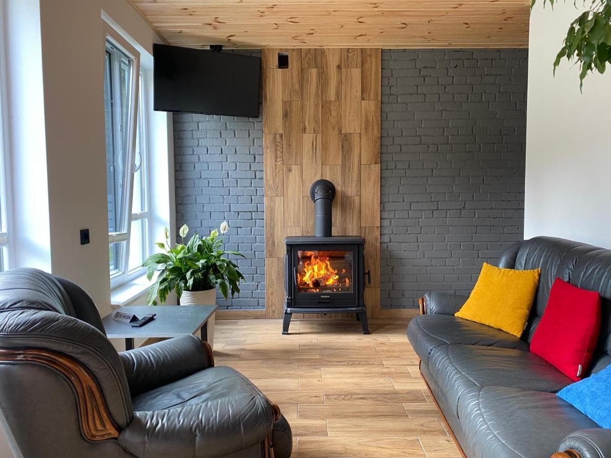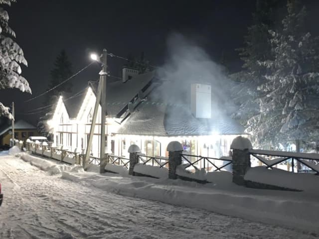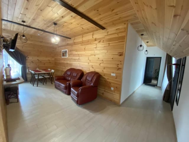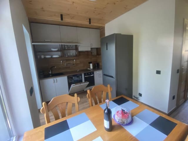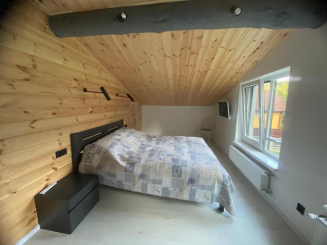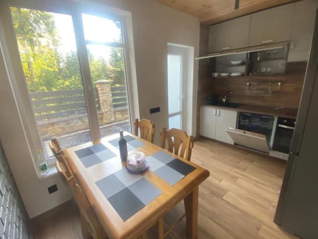 Шале — кухня (індукційна плита, холодильник, мікрохвильова піч, електрочайник, тостер, мийка, посуд, обідній стіл, камін), спальня (двоспальне ліжко, шафа для одягу, телевізор), санвузол (душ, туалет, умивальник).