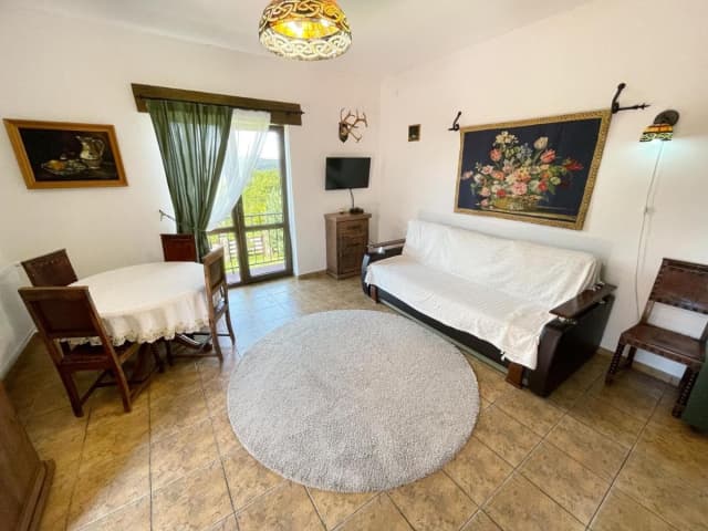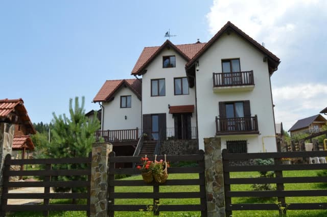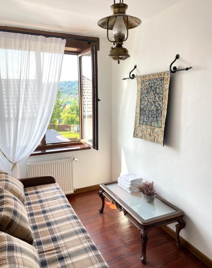 Напівлюкс (1-ий поверх) -(1-кімнатний, 2-місний номер) – 2 односпальні ліжка, розкладний диван, супутникове ТБ, санвузол (душова кабіна, унітаз, умивальник, фен, кількість рушників – 2 на особу). Балкон з видом на гори. Окремий вхід.