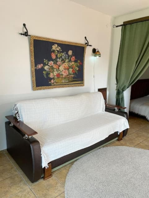 Напівлюкс покращений (2-ий поверх) -(2-кімнатний (арка), 2-місний номер) – вітальня (розкладний диван), спальня ( двоспальне ліжко, розкладне крісло, супутникове ТБ, санвузол (душ, унітаз, умивальник, фен, кількість рушників – 2 на особу). Балкон з видом на гори.
