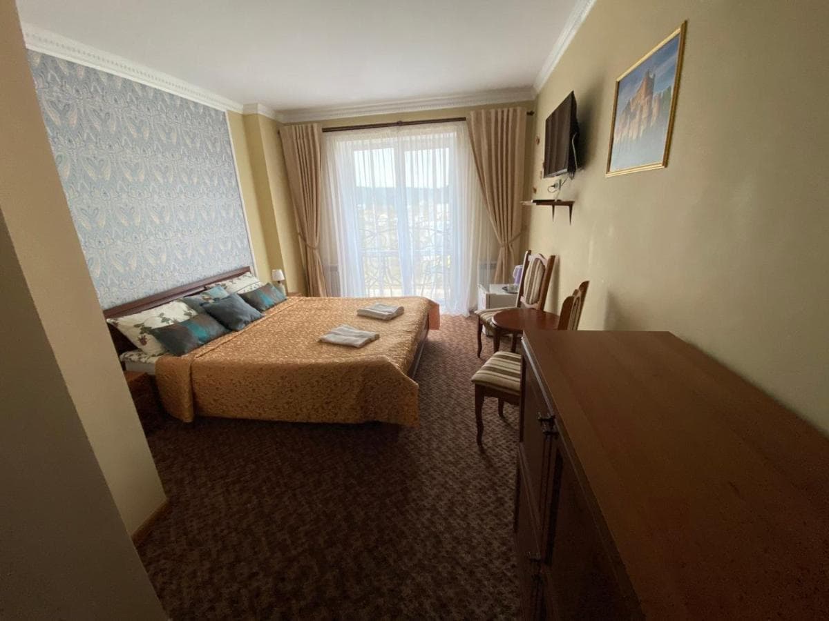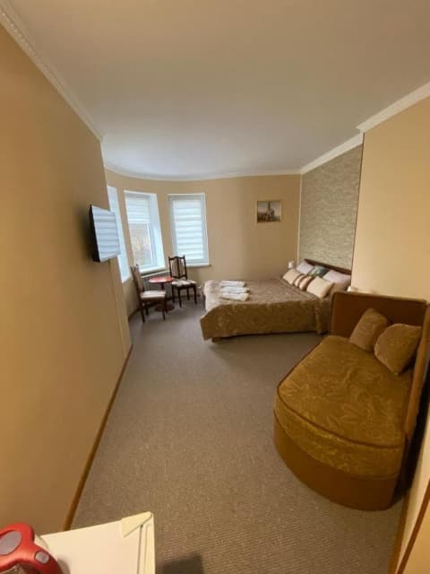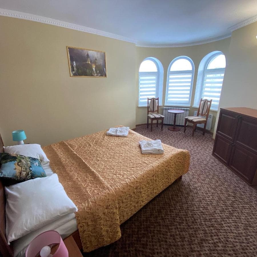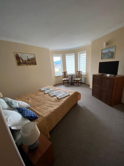 Готель «Три корони» - це красива будівля з вежами та великим панорамним дахом. У кожному номері є телевізор і Wi-Fi. Також є власна ванна кімната з душем і феном. У коридорі є прасувальна дошка. Прасування можна замовити окремо в номерах.
