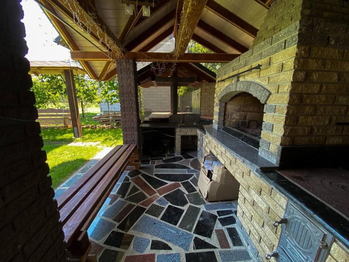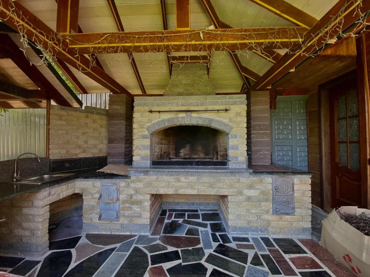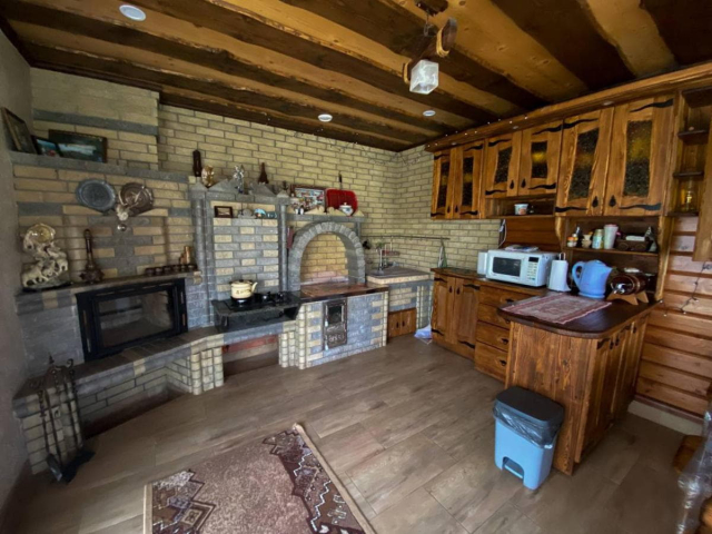 На першому поверсі котеджу розташована зручна кухня з усім необхідним для приготування їжі: кухонне вогнище, мікрохвильова піч, холодильник, електрочайник, мийка, посуд та столові прибори. Тут також є обідній стіл, телевізор і два розкладні крісла. У холі — ще один телевізор та розкладний диван, який стане у пригоді для додаткових місць. Санвузол також на першому поверсі: душ, туалет, умивальник, пральна машина, фен і праска.