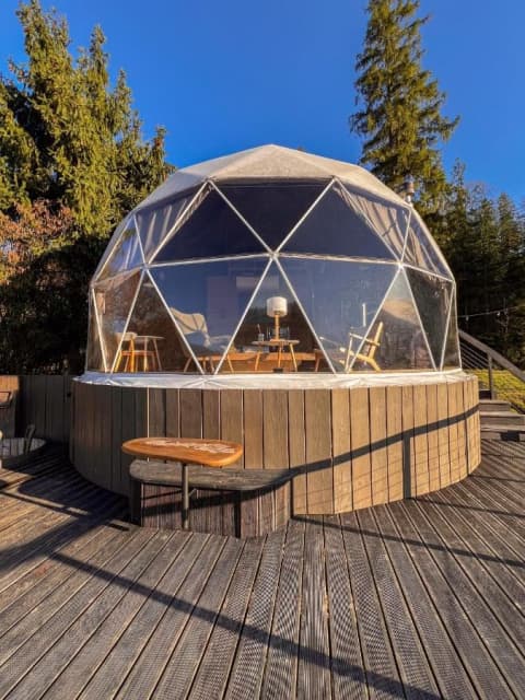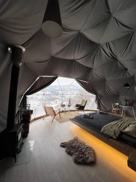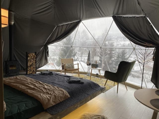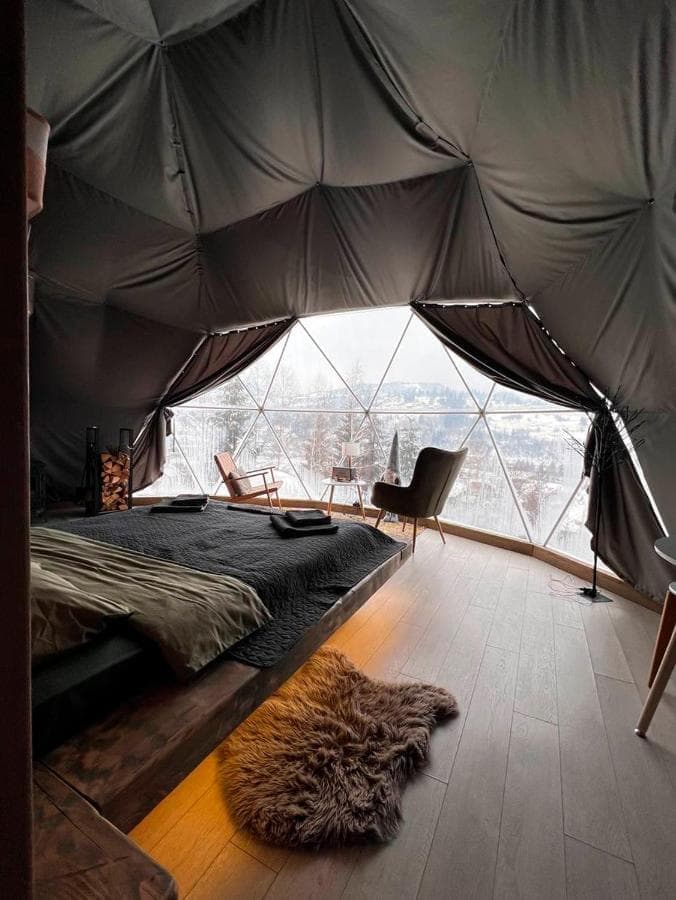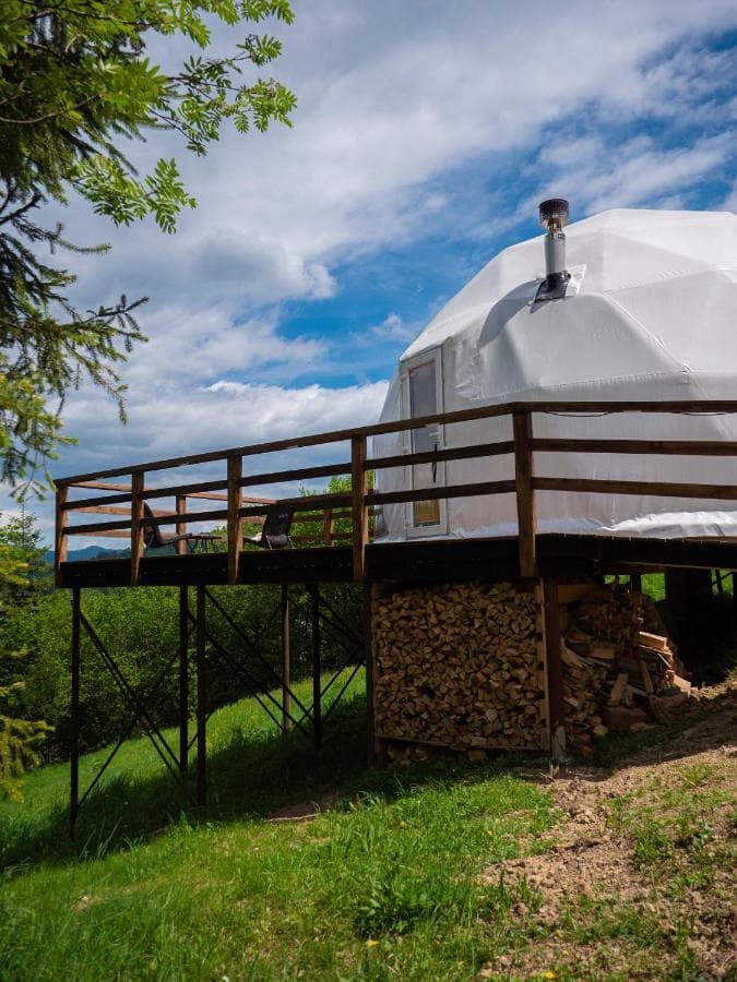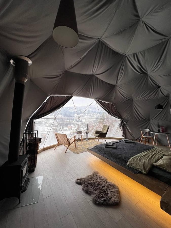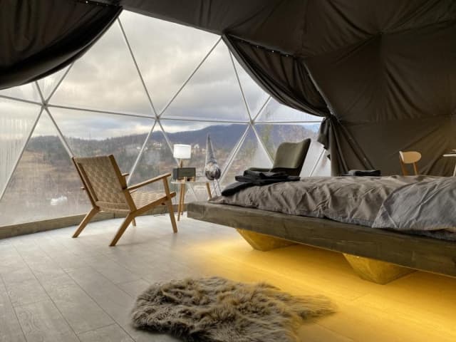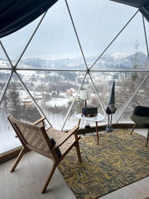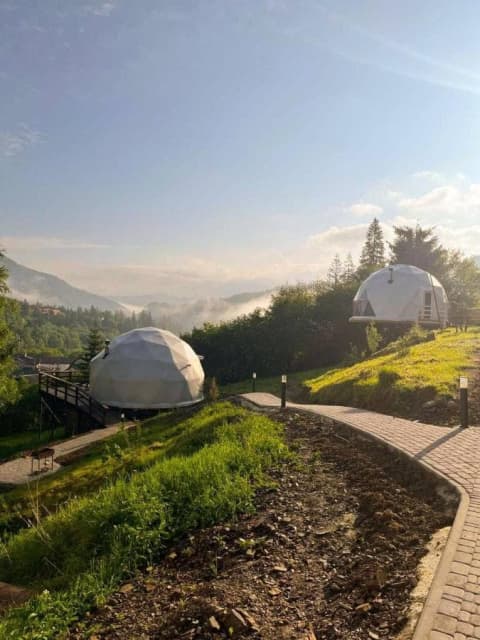 «SlavskoGlamp» глемпінг – це купольний готель, розташований у Славську, з якого відкривається чудовий вид на українські Карпати. Готель складається з трьох куполів, кожен з яких має власну терасу, де можна насолодитися тишею, красою та величчю гір. З панорамних вікон сфер відкривається унікальний вид на карпатські гори, а кімнати наповнені природним світлом і нагадують нам про наш постійний зв'язок з природою.