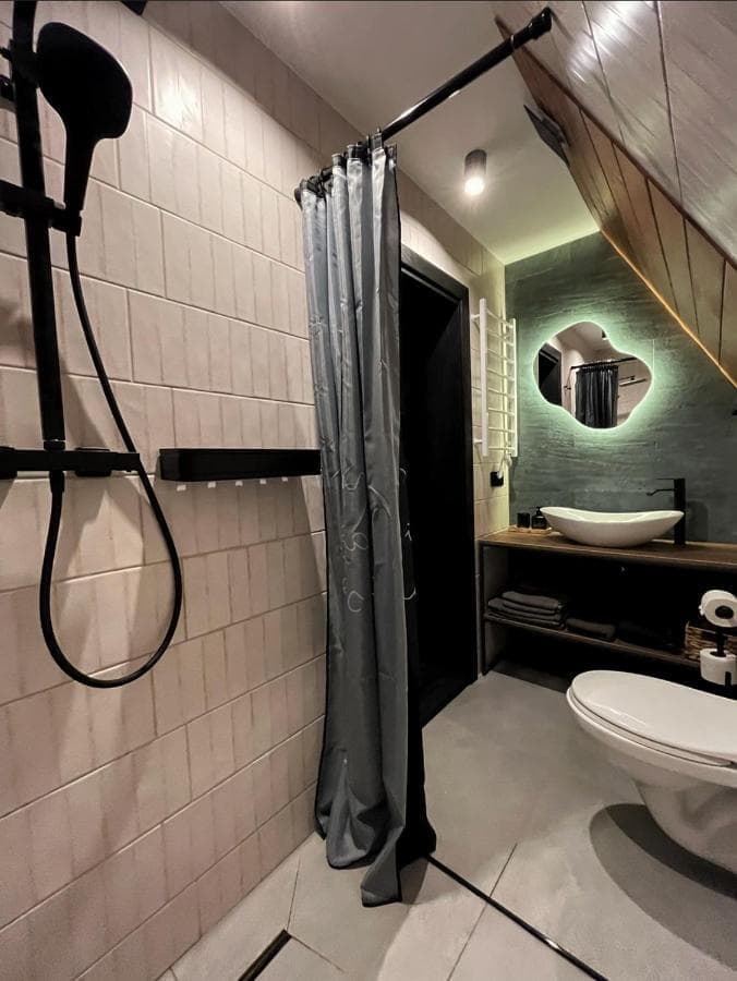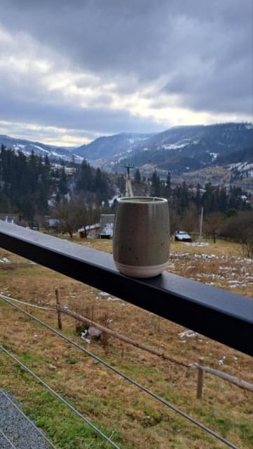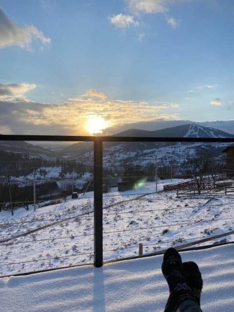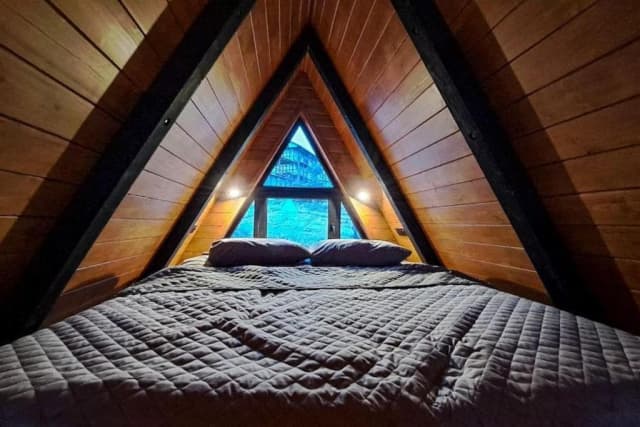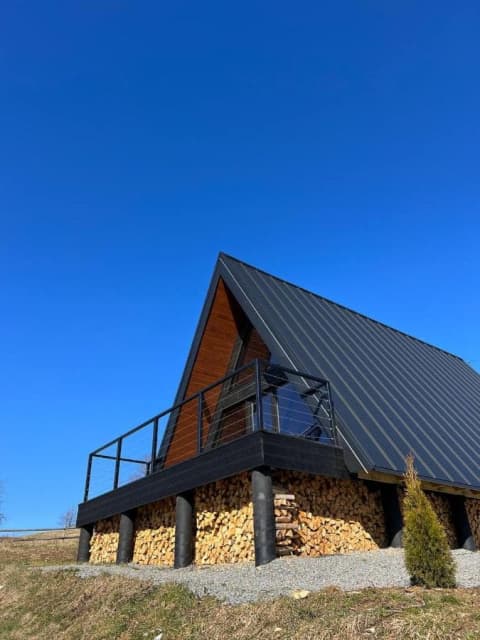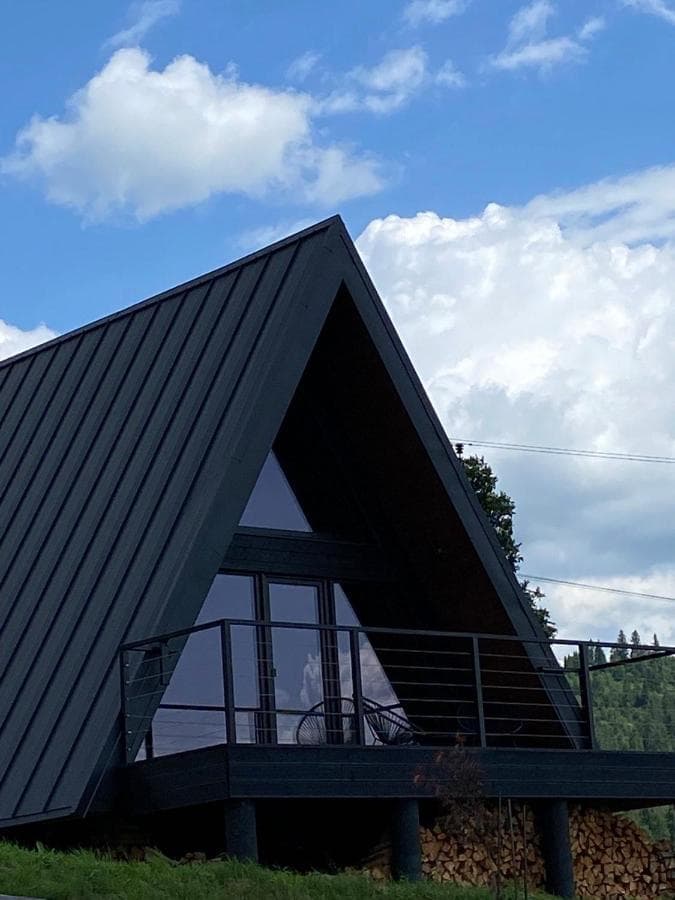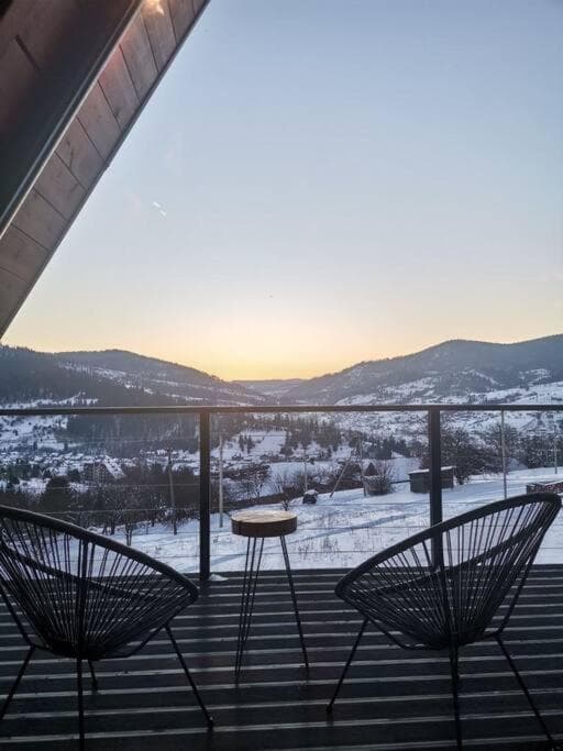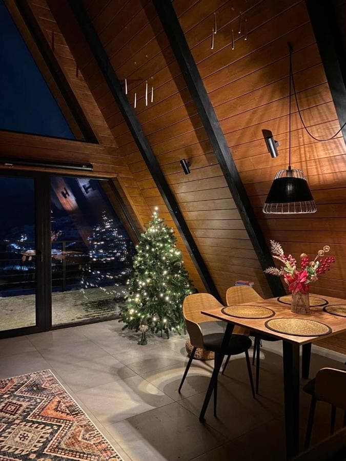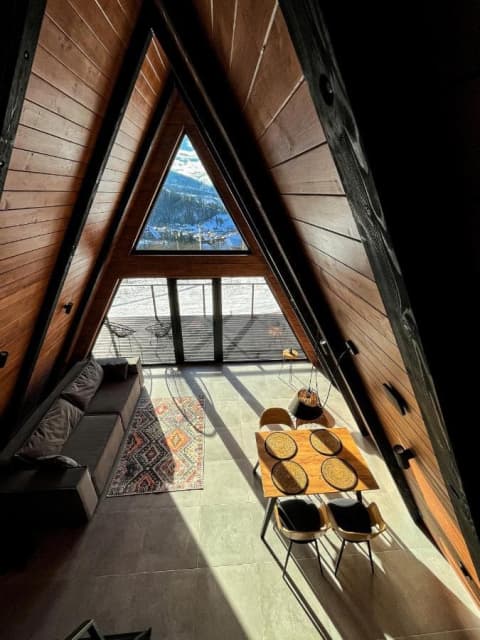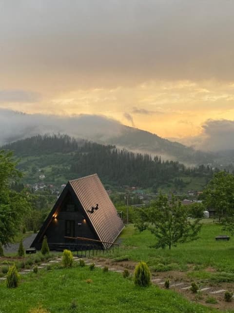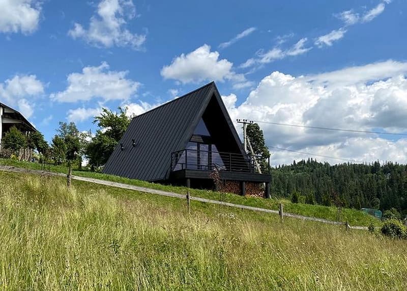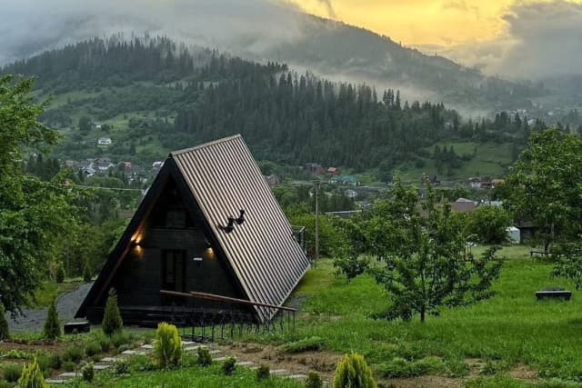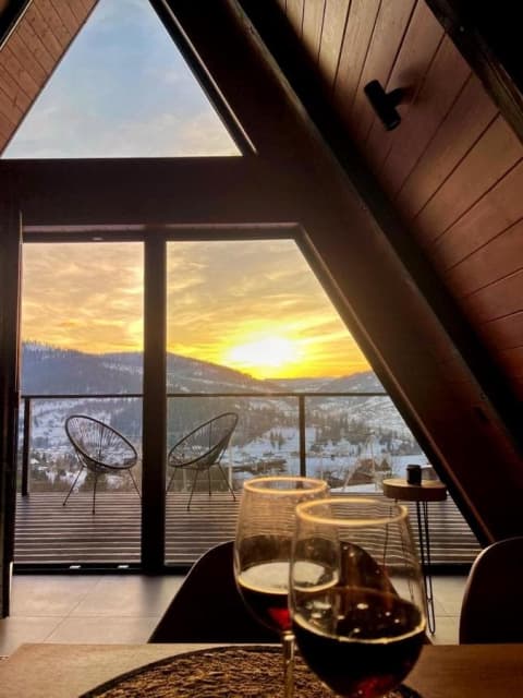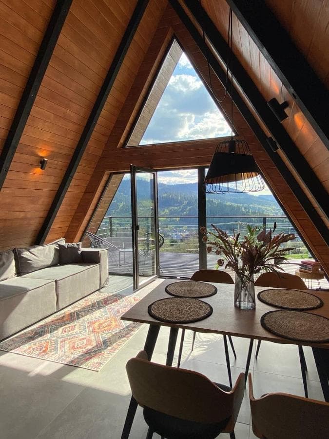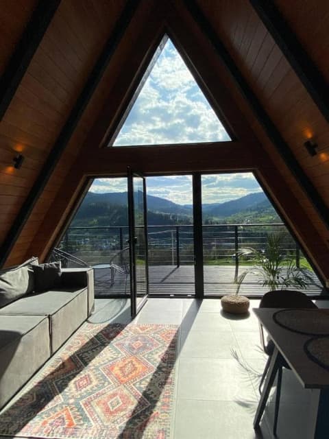 A-Frame «Mirador Cottage» розташований на горі Погар в Славську. З панорамних вікон відкривається приголомшливий вид на гори. Будинок стильно мебльований. У ньому є все необхідне для комфортного проживання. Також є підігрів підлоги.