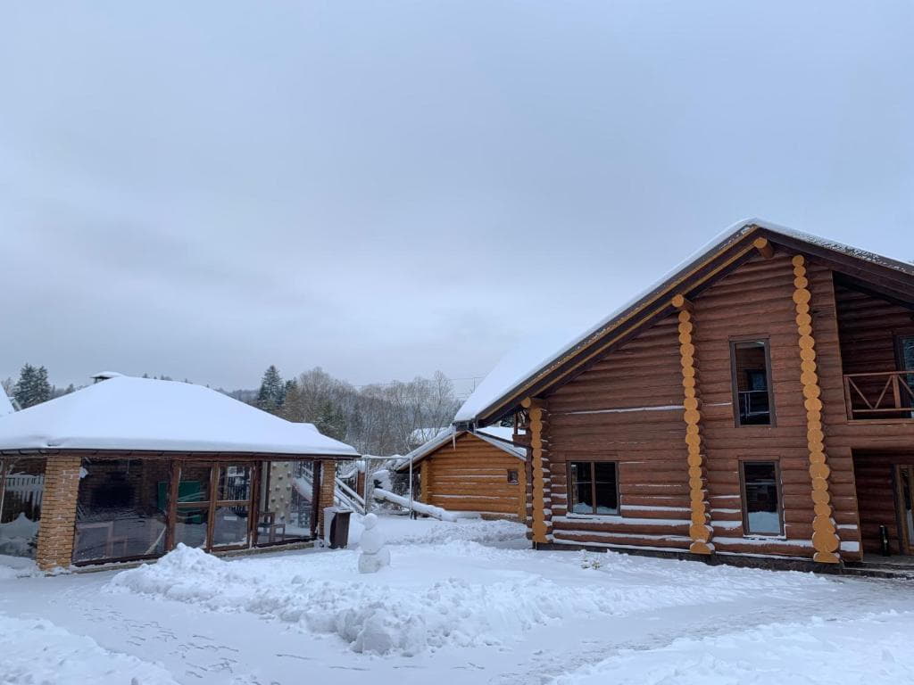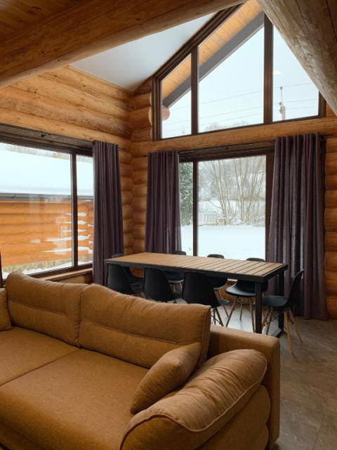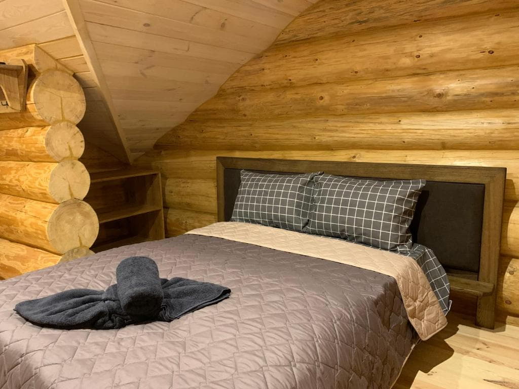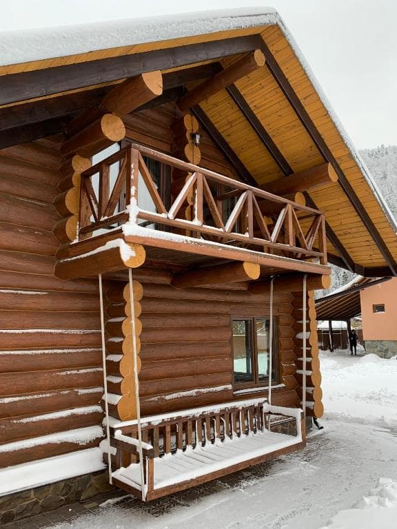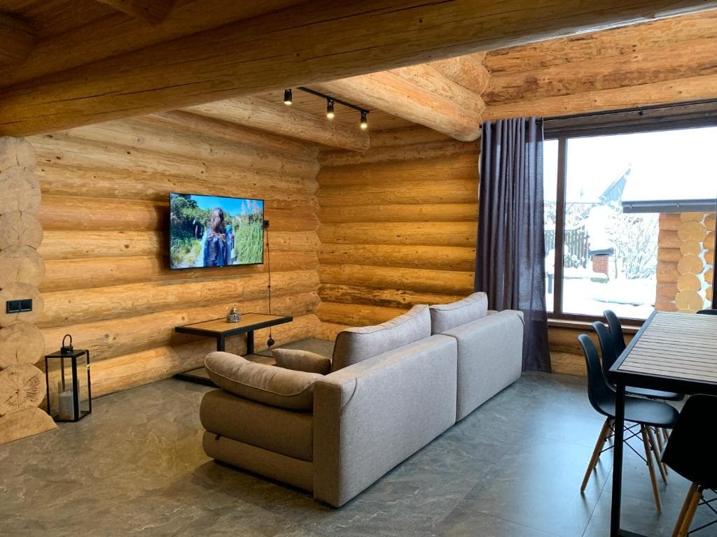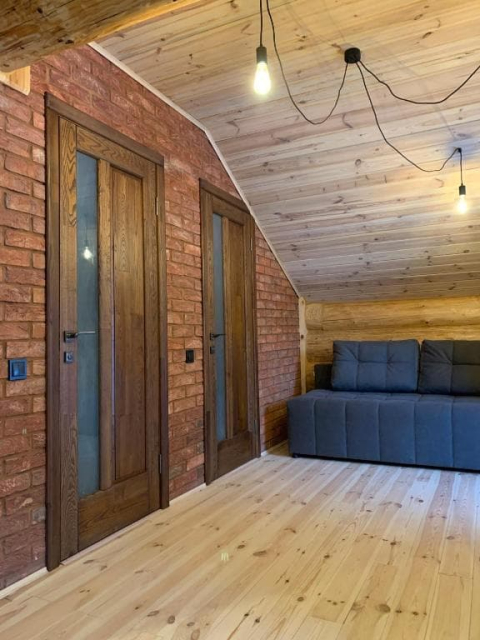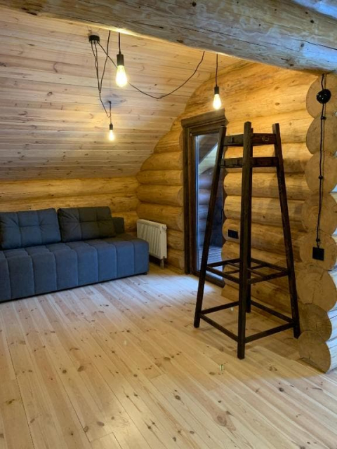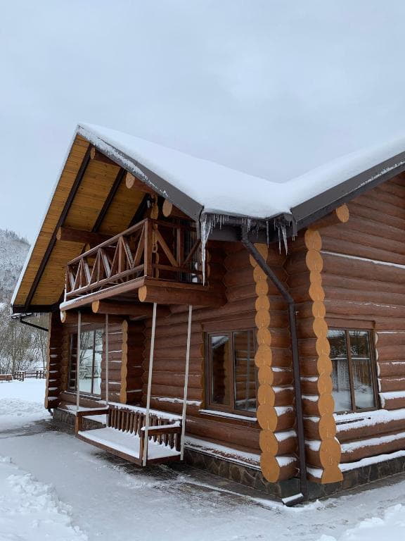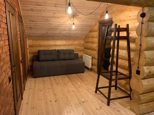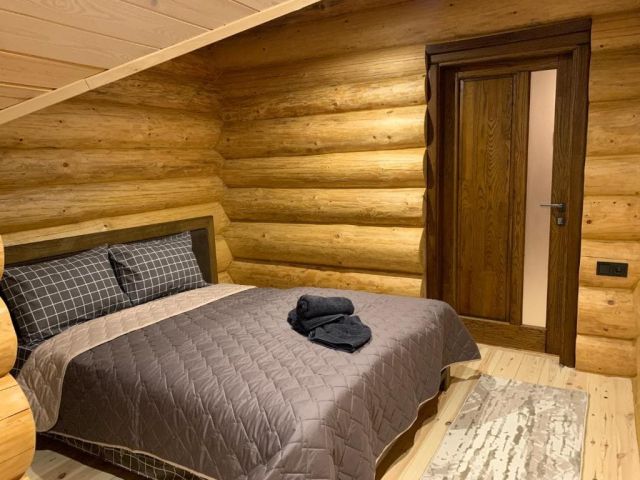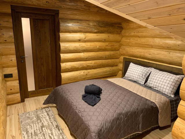 Двоповерховий дерев’яний котедж на закритій території, що вміщує до 12 гостей. На території також є сауна, критий мангал з альтанкою, дитячий майданчик та тераса над річкою — ідеальне місце для сімейного або компанійного відпочинку серед природи.