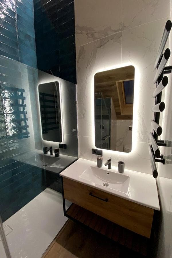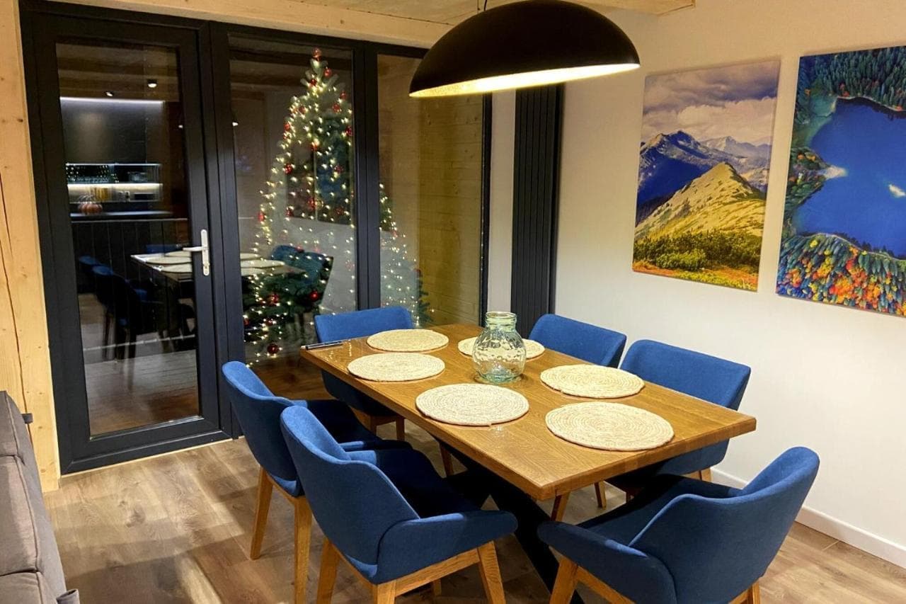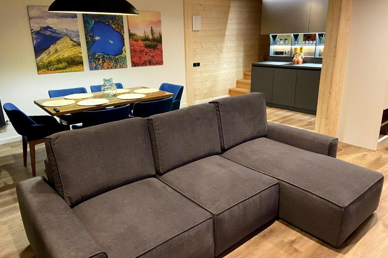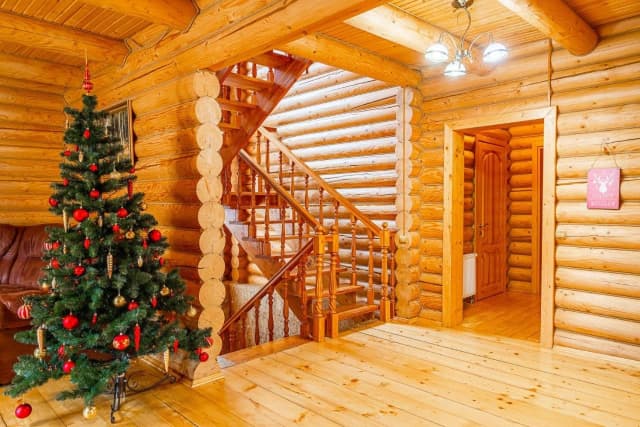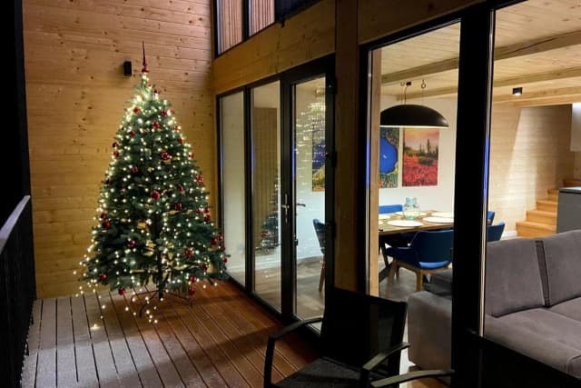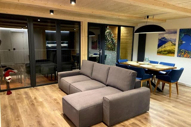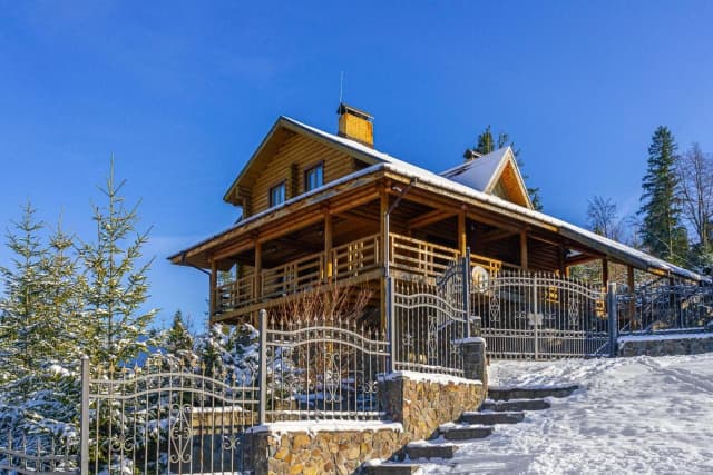 Великий триповерховий котедж – це котедж зі зруба для великої сім’ї або компанії до 10 гостей, тут є 4 спальні, вітальня з каміном, кухня та столова, тераса з панорамним видом на гори.