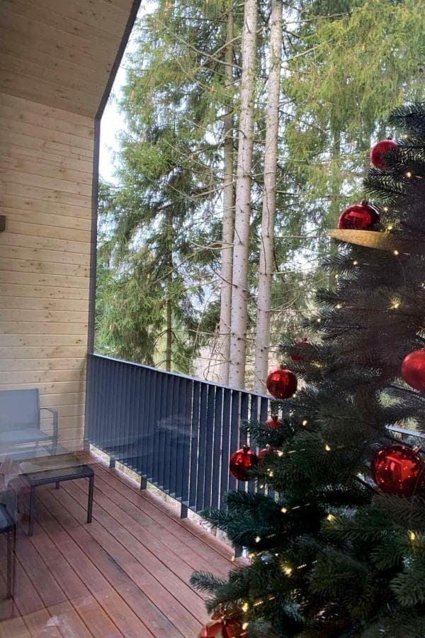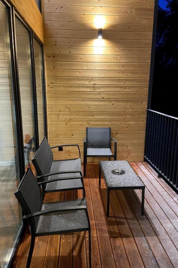Вілла Делюкс – це барнхаус для 2 пар, або сім’ї з дорослими дітьми де є 2 спальні з окремими санвузлами та вітальня з кухнею і каміном, тераса з видом на ліс;