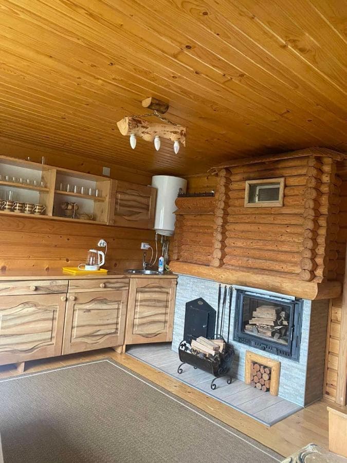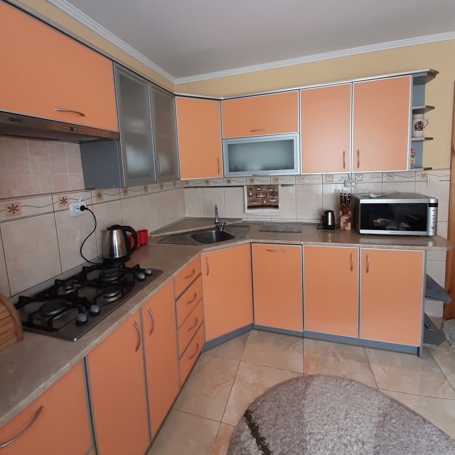 Кухня в садибі «Сухар» облаштована всім необхідним: плита, чайник мікрохвильова піч, мийка, робоча поверхня, обідній стіл, табуретки.