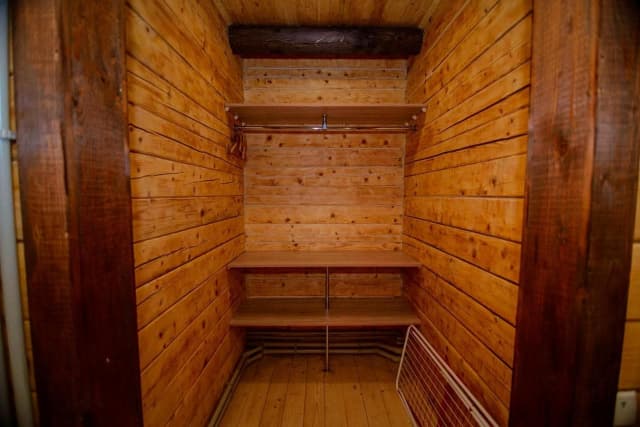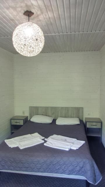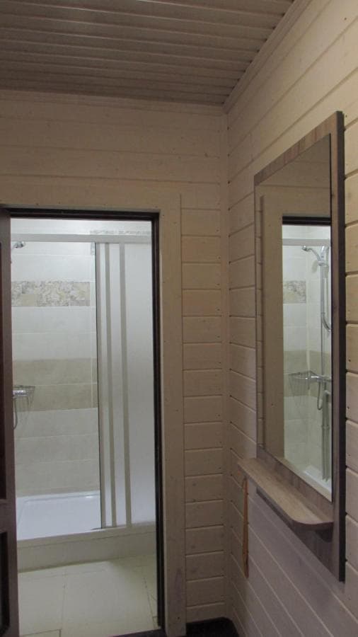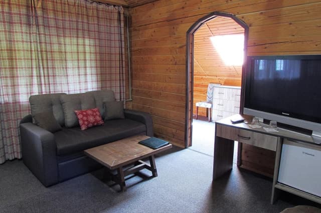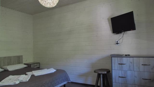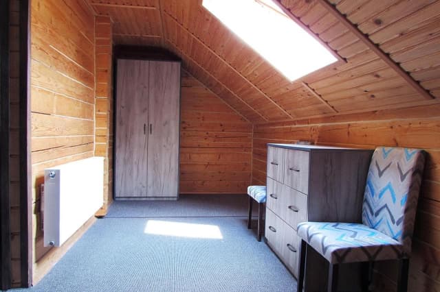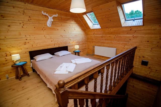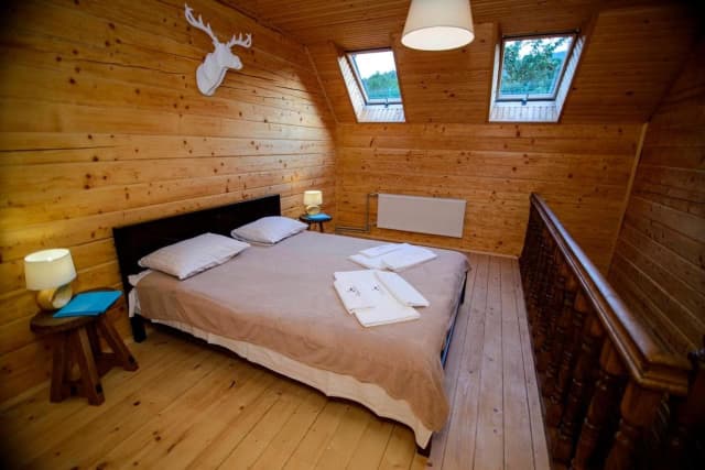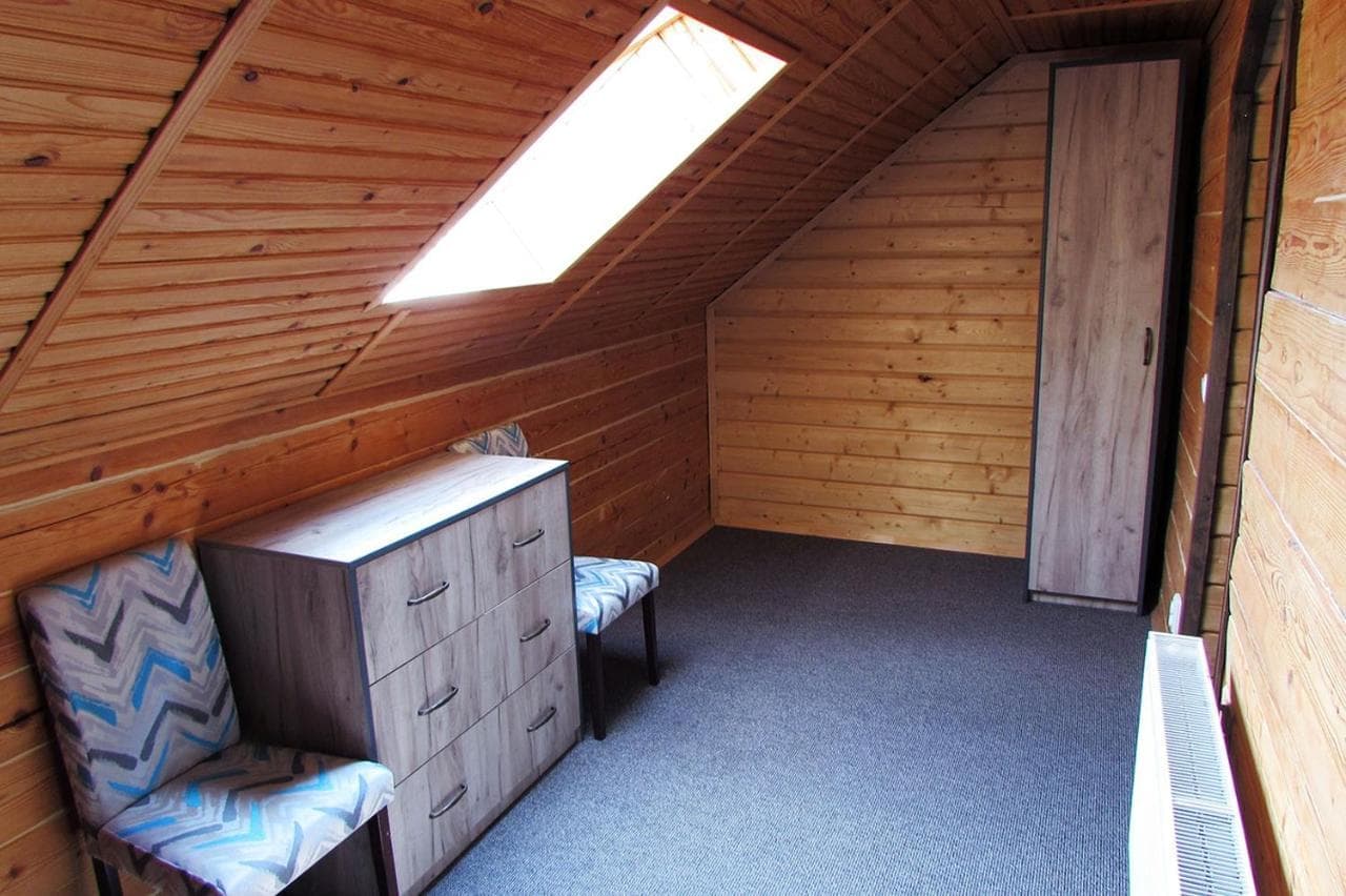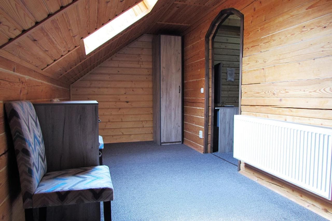 На першому поверсі знаходиться санвузол з душовою кабіною, шафа, телевізор, холодильник та розкладний диван. На другому – світла спальня з широким ліжком та вікнами на стелі.