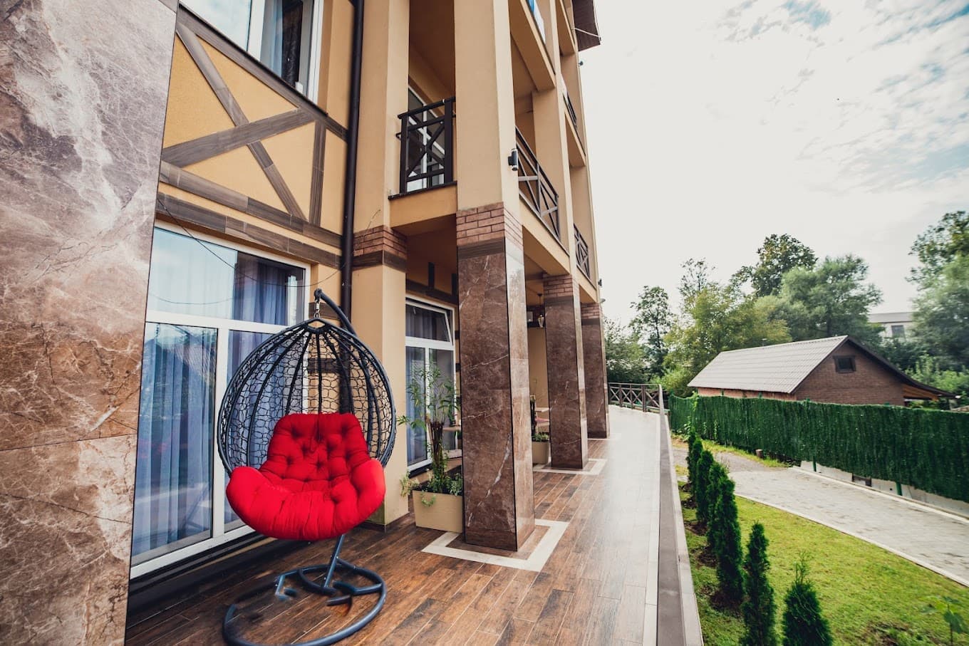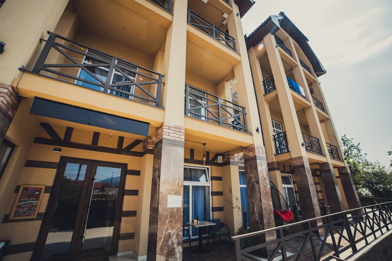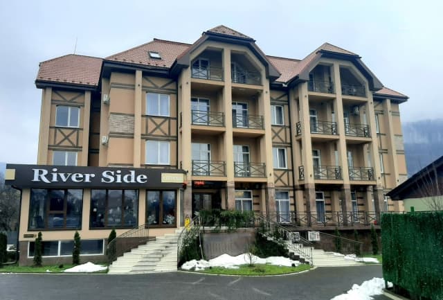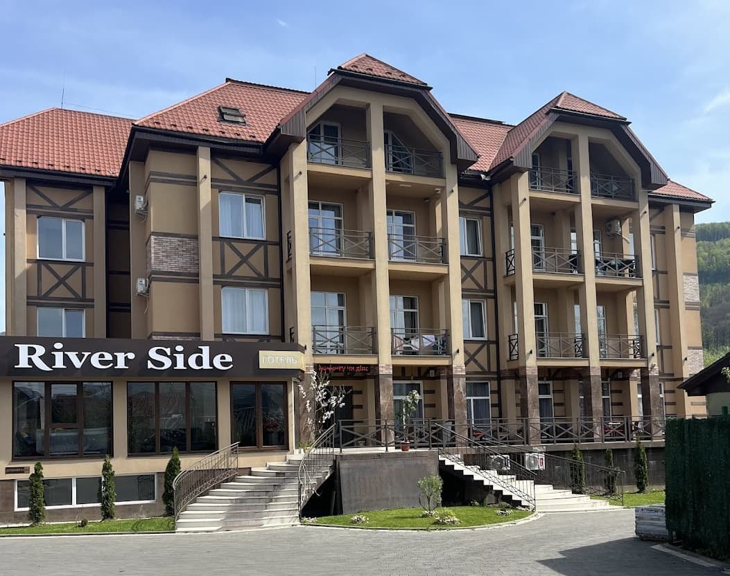Готель «River Side» з видом на гори на березі гірської річки в с. Поляна. В готелі 4 поверхи, власний ресторан із найкращим кухмейстром та 30 номерів в європейському стилі! В кожному номері є приватна ванна кімната, меблі та інші зручності. Також до ваших послуг безкоштовний приватний паркінг під цілодобовою охороною.