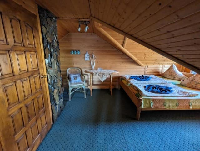 На другому поверсі — двокімнатний (прохідний) номер, в одній кімнаті — двоспальне та односпальні ліжка, в другій — двоспальне ліжко, є шафи для одягу, телевізор (кабельне телебачення), санвузол (туалет, умивальник, душ). Два тримісних та 1 двомісний номери, в кожному — двоспальне ліжко, шафа для одягу, телевізор, санвузол (туалет, умивальник, душ), в тримісному є також односпальне ліжко.