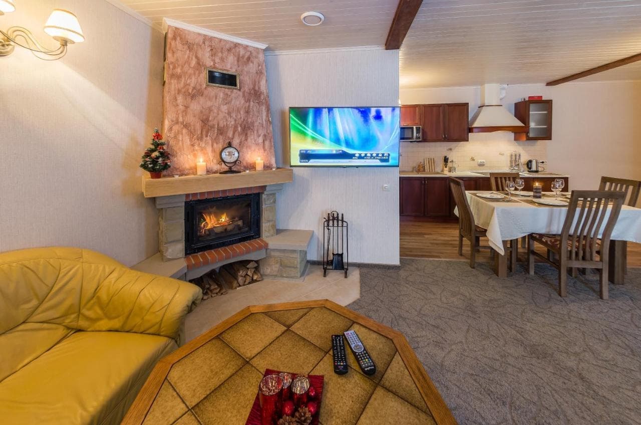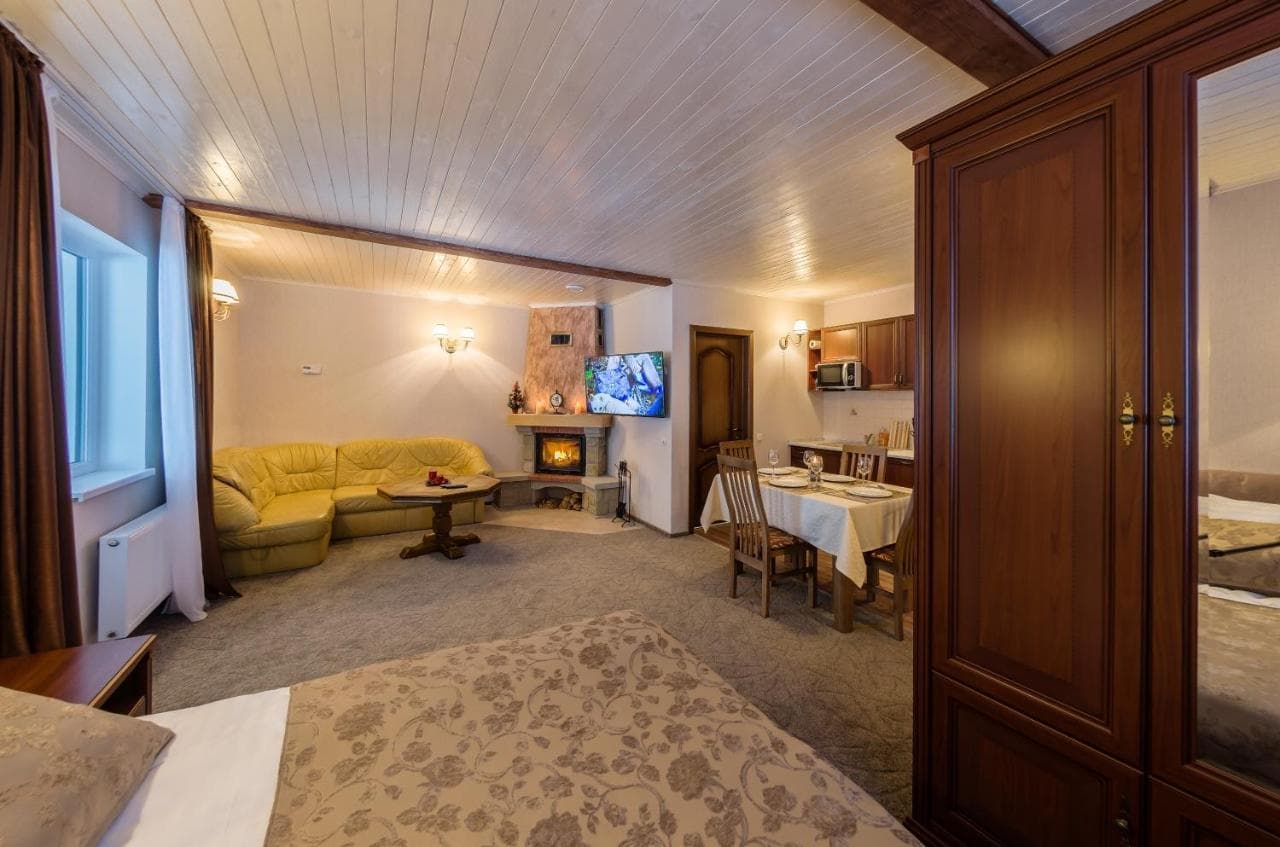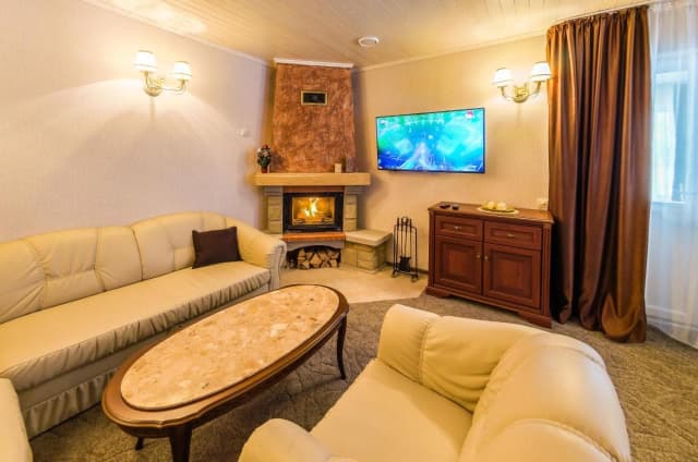 Апартаменти готелю «5 камінів» оснащені сейфом та РК-телевізором із супутниковими каналами. До послуг гостей вітальня з відкритим каміном і ванна кімната з феном, туалетно-косметичним приладдям та підлогою з підігрівом.