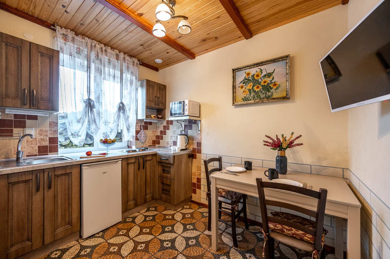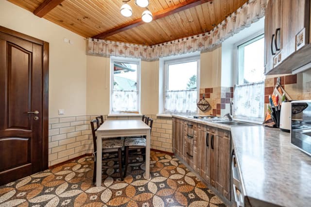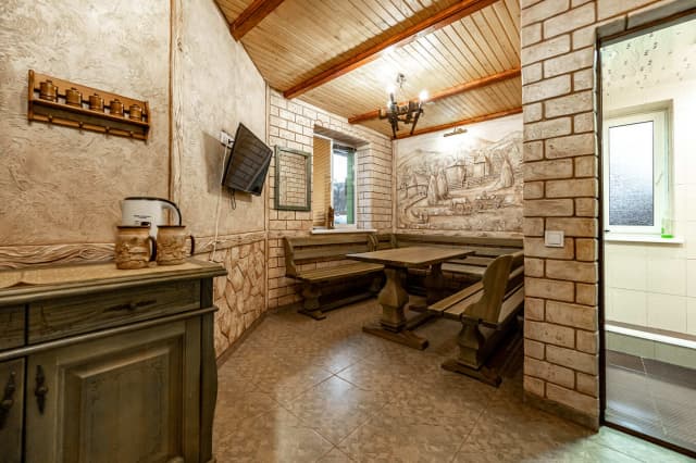 На первом этаже – кухня-гостиная с комфортабельным раскладным диваном. В гостиной находится камин для проведения теплых вечеров в семейном кругу.