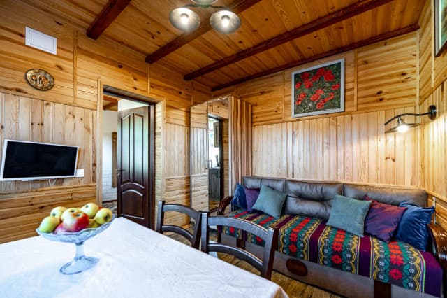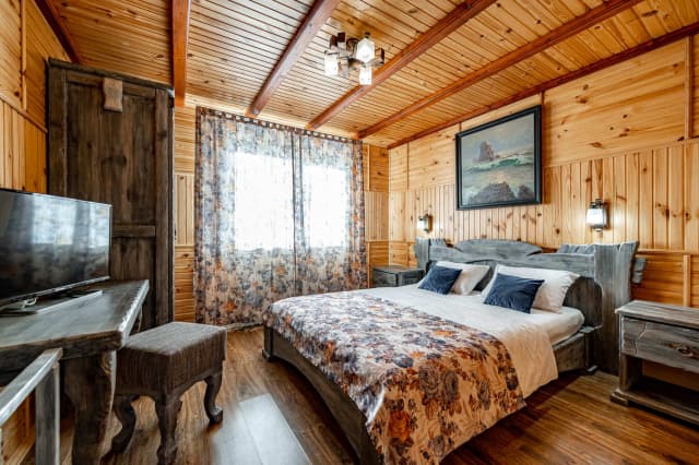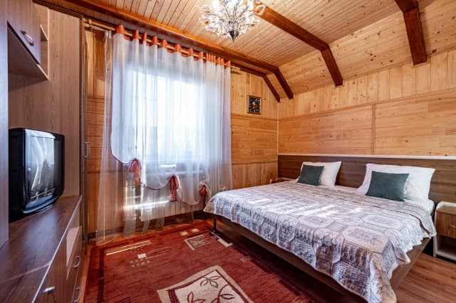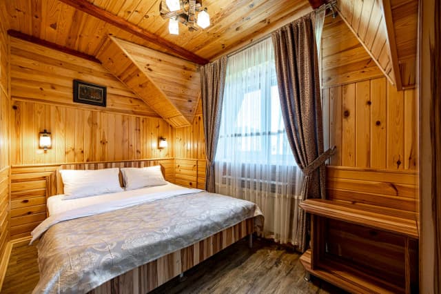 Двухэтажный коттедж средней площадью 43 м2, рассчитанный на 2-4 человека. На первом этаже расположена кухня с комфортабельным раскладным диваном. На втором – спальня, санузел и балкон с видом на горы. Ширина кровати 160 см.