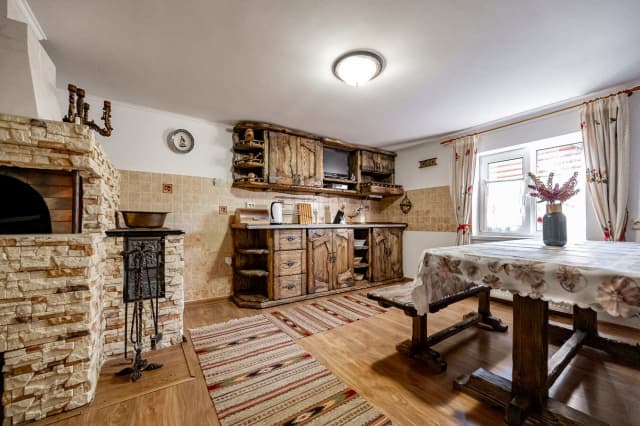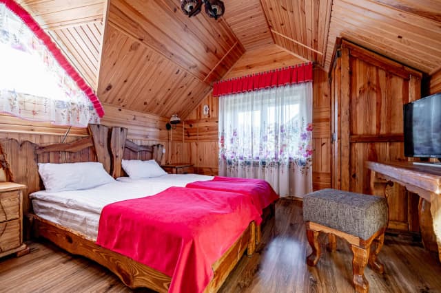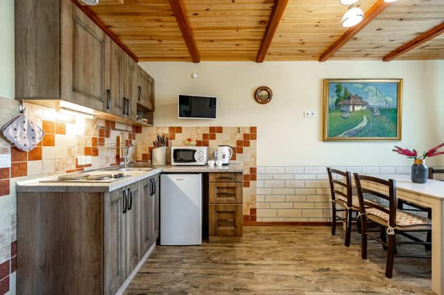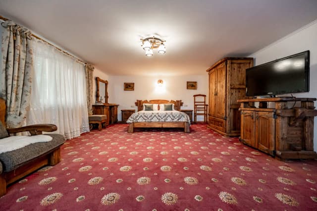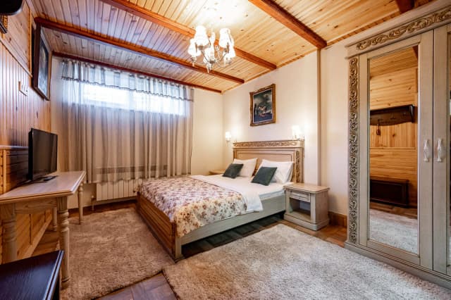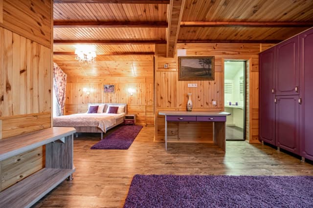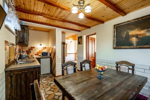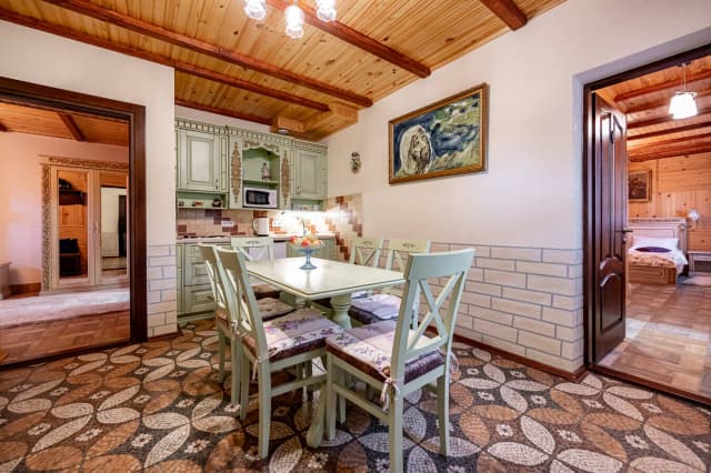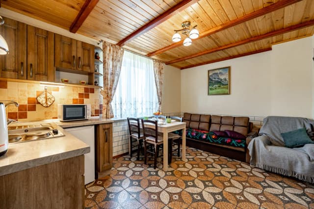 На первом этаже расположена кухня с диваном. На втором – спальня-гостиная, санузел и балкон с видом на горы. Ширина кровати 160 см. Номер укомплектован всем необходимым для уютного отдыха компании до 6 человек.