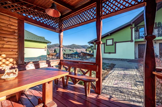 На территории комплекса: крытые беседки с мангалами, колыба, 2 бассейна с подогревом (взрослый и детский), работающих в теплое время года, детская площадка и детская комната отдыха.