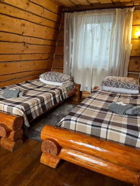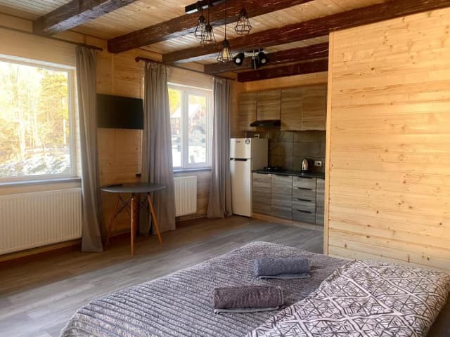 На первом этаже - кухня (электрическая плита, холодильник, электрочайник, посуда), 2 двухместные комнаты (в одной есть двуспальная кровать, раскладное кресло, шкаф для одежды, телевизор, камин, стол со стульями, в другом - двуспальная кровать, шкаф для одежды), санузел (душ, туалет, умывальник). На втором этаже (с отдельного входа) – 2 двухместные комнаты (в одной есть двуспальная кровать, шкаф для одежды, телевизор, в другом – двуспальная кровать, шкаф для одежды), санузел (душ, туалет, умывальник). Отопление: автономное водяное. Водоснабжение: холодная и горячая вода постоянно.