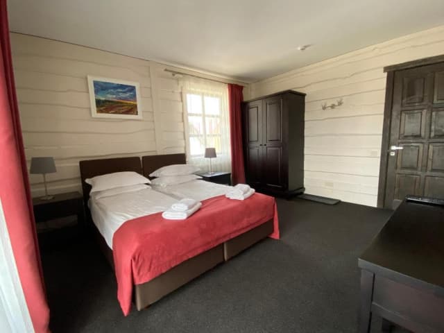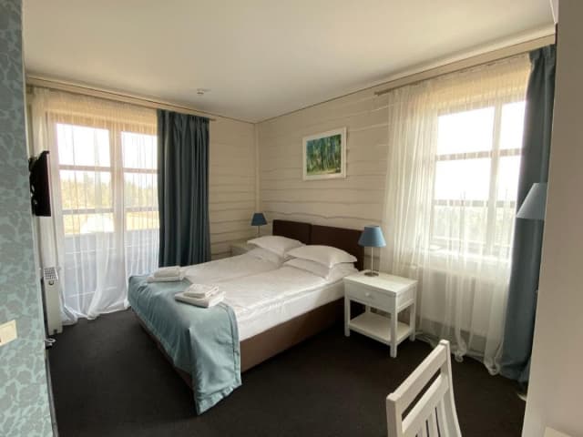 На втором этаже — двухкомнатный номер (спальня — двуспальная кровать, раскладное кресло, телевизор, гостиная — раскладной диван, шкаф для одежды, санузел — ванная, туалет, умывальник), полулюкс (двуспальная кровать, 2 раскладных кресла, шкаф для одежды, телевизор, камин, санузел — душ, туалет, умывальник).