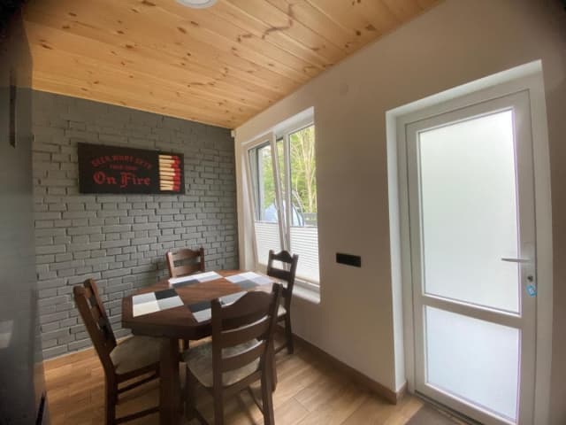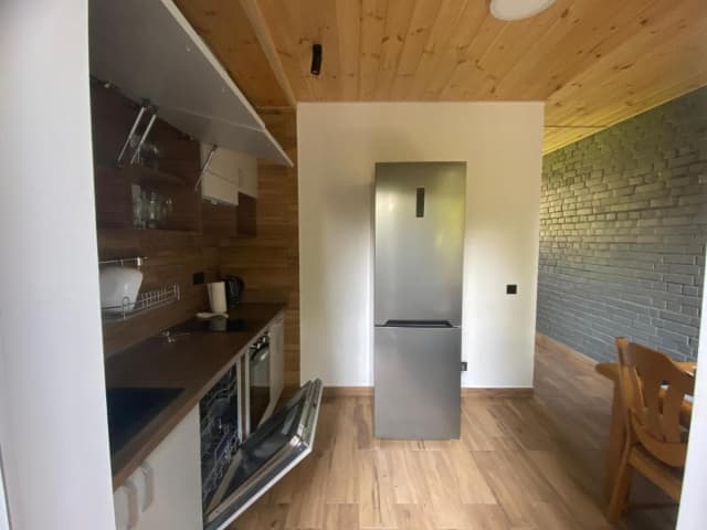 Шале с двумя спальнями (2 шале) — кухня (индукционная плита, холодильник, микроволновая печь, мультиварка, электрочайник, духовой шкаф, посудомоечная машина, тостер, мойка, посуда, обеденный стол, камин), 2 спальни (в каждой есть 2 спальни) санузел (душ, туалет, умывальник, стиральная машина, паровой утюг).