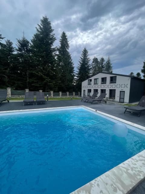 Двухэтажное здание, построенное в 2019 году, имеет восемь апартаментов (24 места) и три шале.