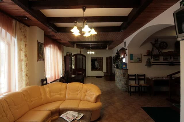 Дом на 18 номеров (до 54 мест), а также рецепция с холлом, конференц-зал, столовая, сауна, обустроена территория с детской площадкой и спортивной площадкой, беседками и мангалом.