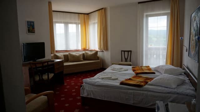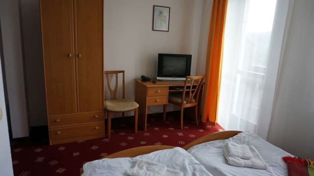 Полулюкс (8 номеров) — 2 раздвижные односпальные кровати, раскладной диван, шкаф для одежды, телевизор, холодильник, телефон, сейф, ковровое покрытие, санузел (туалет, умывальник, душевая кабина, фен).
