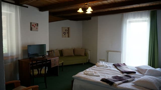 Мансардный (2 номера) — 3 сдвигающиеся односпальные кровати, шкаф для одежды, холодильник, телевизор, телефон, письменный стол, сейф, ковровое покрытие, санузел (туалет, умывальник, душевая кабина, фен).