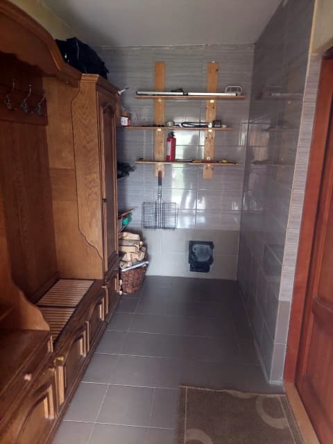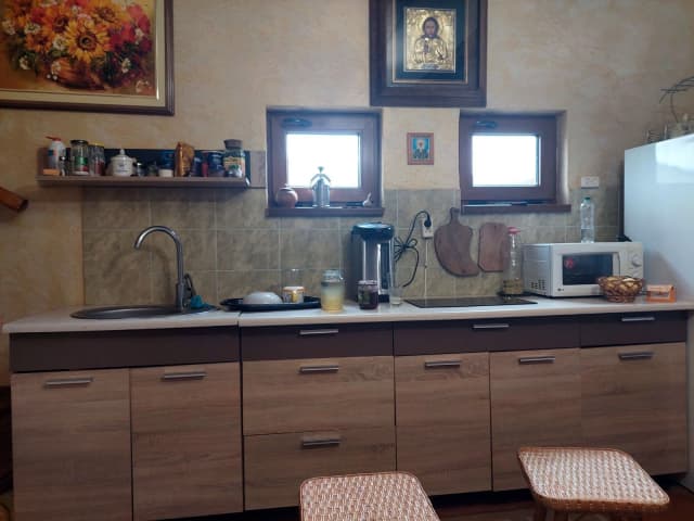 К услугам гостей дома на первом этаже находится полностью обустроенная кухня (холодильник, микроволновка, электрическая плита, вся посуда, теплая и холодная вода), санузел с душевой кабиной, туалет, стиральная машинка, бойлер.