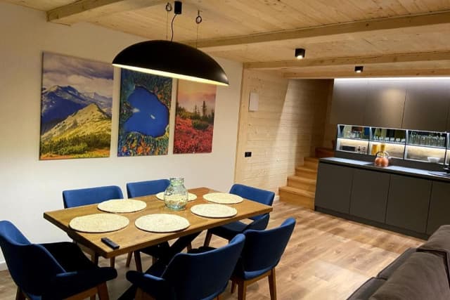 Большой трехэтажный коттедж – это коттедж из сруба для большой семьи или компании до 10 гостей, здесь есть 4 спальни, гостиная с камином, кухня и столовая, терраса с панорамным видом на горы.