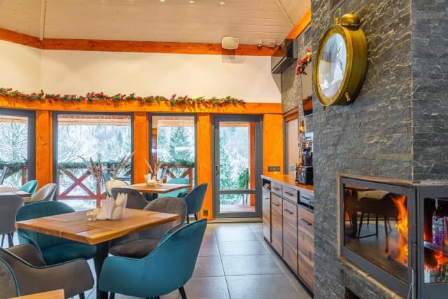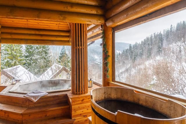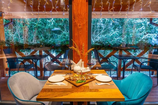На территории есть ресторан, где можно отведать блюда локальной карпатской кухни, традиционные украинские блюда, а также настоящую итальянскую пиццу из помпейской печи и мраморные стейки на гриле. Также к Вашим услугам SPA-зона с сауной и чан с видом на горы. На территории есть парковая зона для прогулок, детская площадка, а летом работает бассейн.