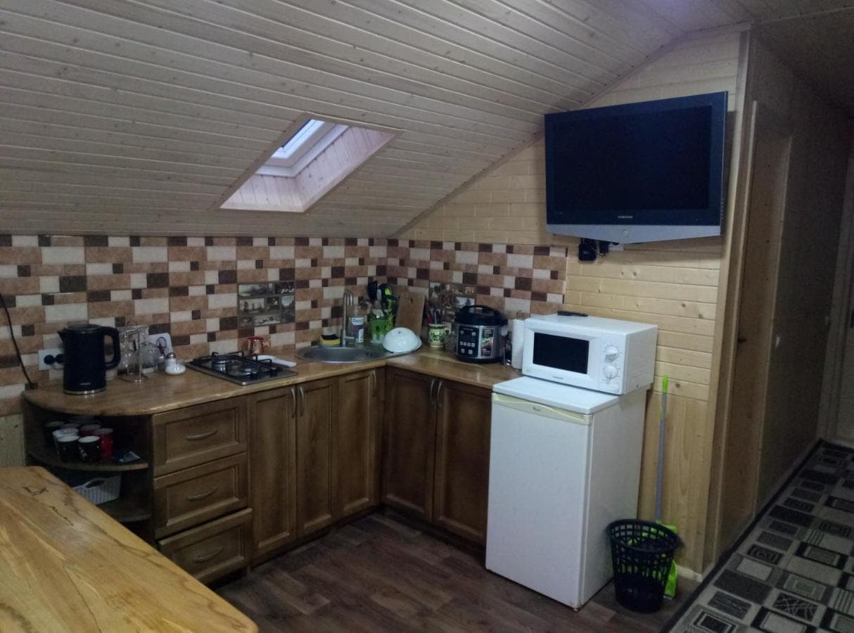На первом этаже — кухня (газовая плита, холодильник, электрочайник, микроволновка, мойка, посуда, стол, телевизор); гостиная (диван, стол со стульями); 2 двухместных комнаты (двуспальная или 2 односпальные кровати, вешалка для одежды); санузел (душ, туалет, умывальник, фен).