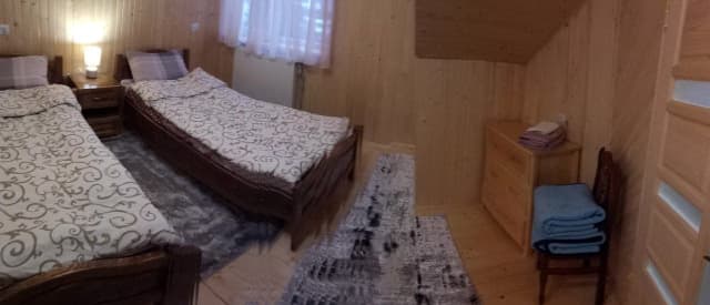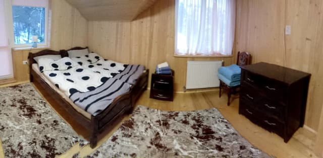 На втором этаже — прихожая; кухня (газовая плита, холодильник, электрочайник, мультиварка, микроволновка, мойка, посуда, стол, телевизор); 3 двухместных комнаты (двуспальная или 2 односпальные кровати, комод, в двух комнатах есть балкон); санузел (душ, туалет, умывальник, фен).