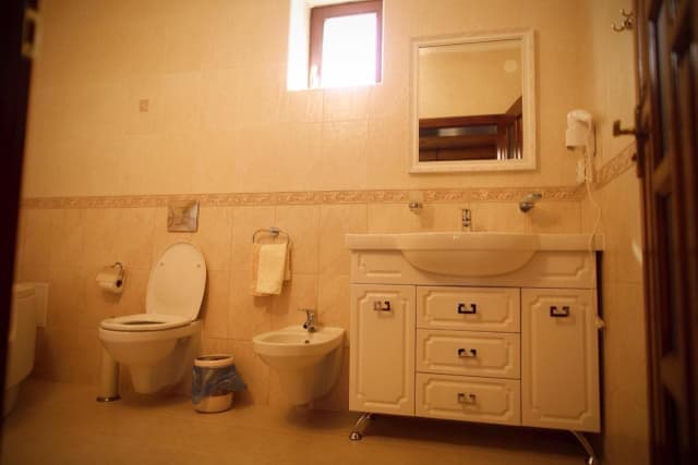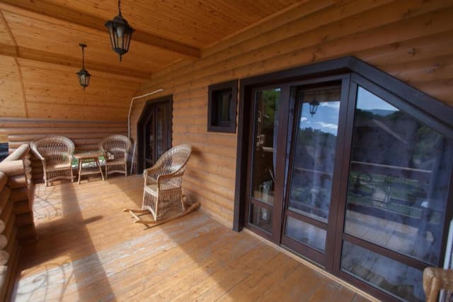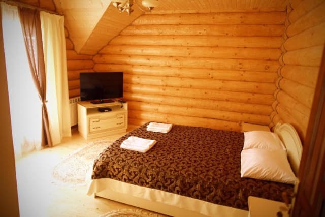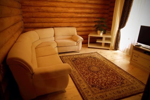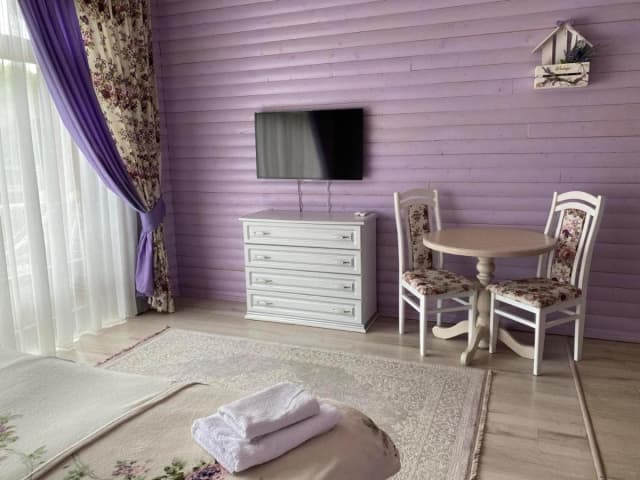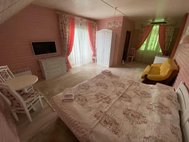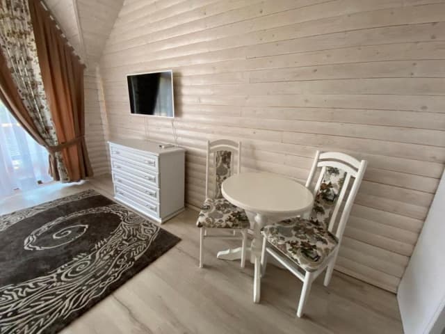 Коттедж (8-местный) — 2 спальни (2 двуспальные кровати, 2 раскладных дивана), гостиная, кухня (холодильник, кухонная посуда, электрочайник), балкон, терраса, фен, утюг, сейф, санузел (душ, биде, ванна, туалет, умывальник).